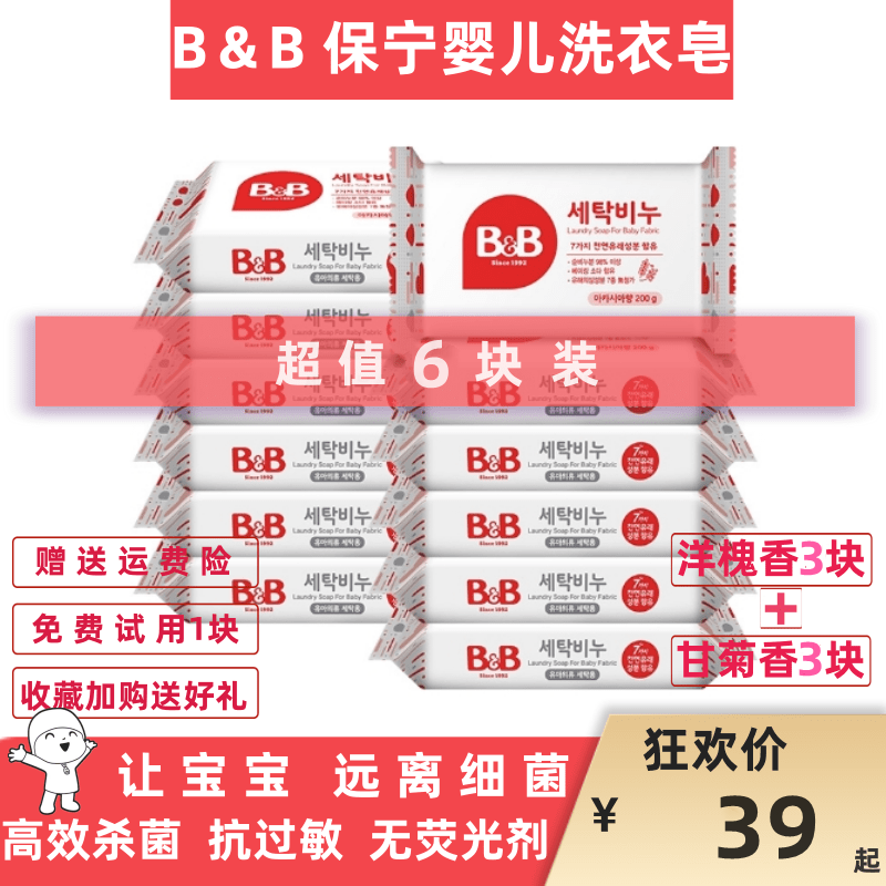 韩国保宁皂洗衣皂200g*6块装洋槐香新生宝宝bb肥皂婴儿儿童尿布皂
