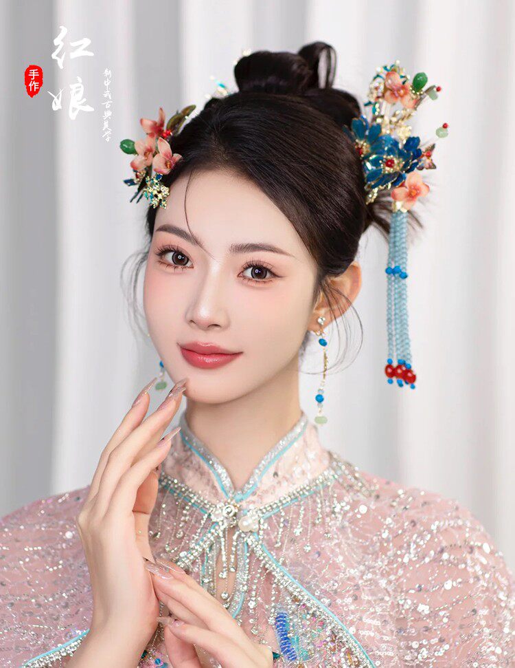 红娘新娘新款手工蓝色花朵轻奢典雅晨袍秀禾流苏发簪古装旗袍头饰