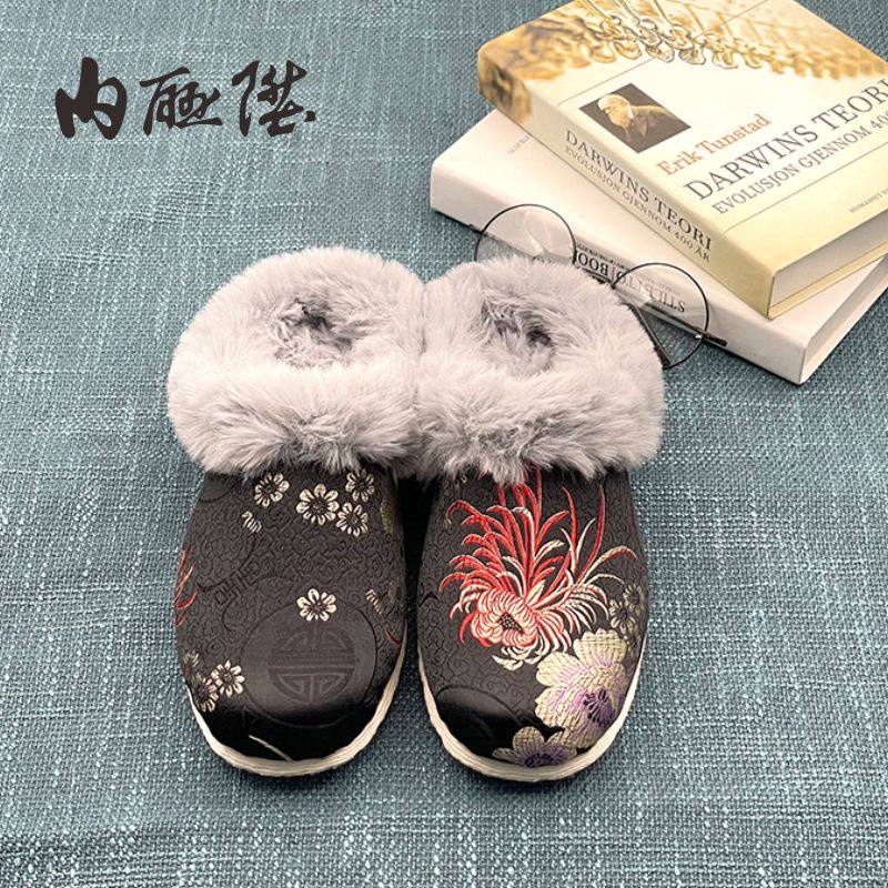 内联升布鞋女鞋拖鞋秋冬季手工千层底女家居织锦缎毛口拖鞋2200C