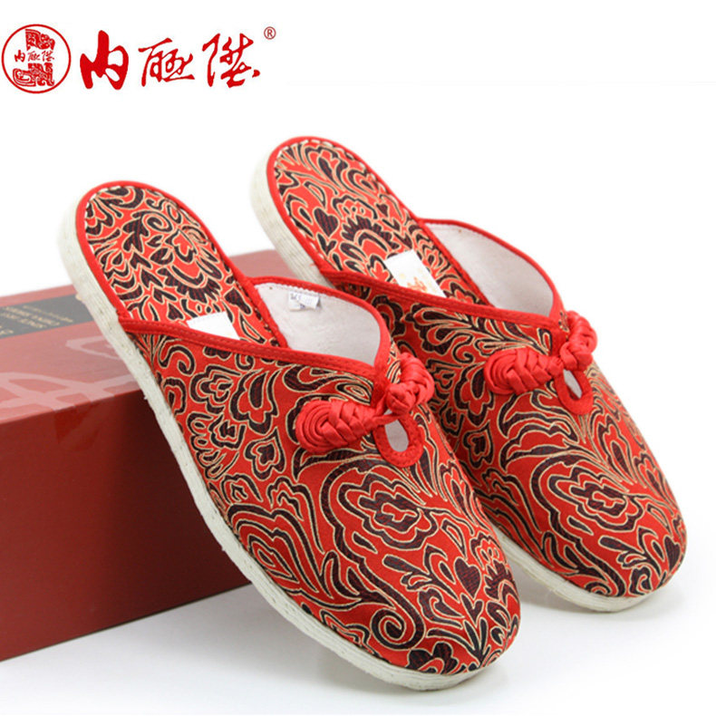 内联升女鞋手工千层底包头拖鞋织锦盘扣老北京布鞋居家拖鞋2040C
