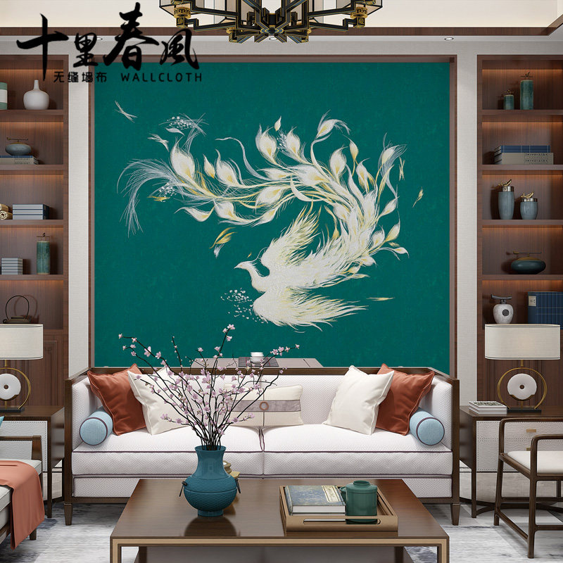 新中式凤凰独绣墙布独秀电视沙发背景墙客厅卧室玄关厂家直销墨绿