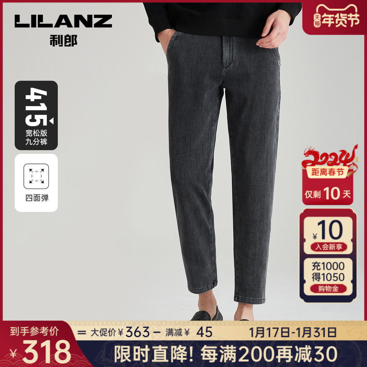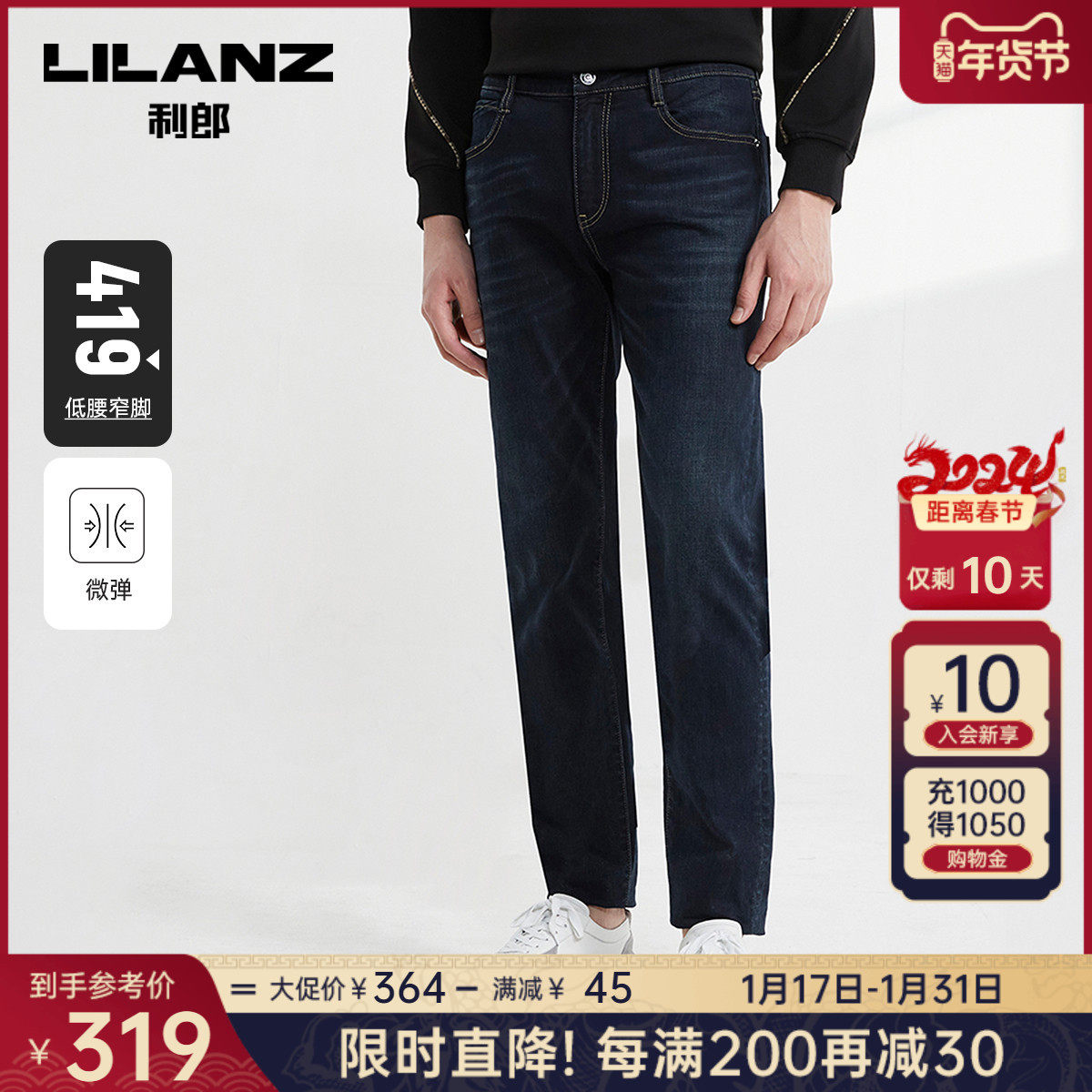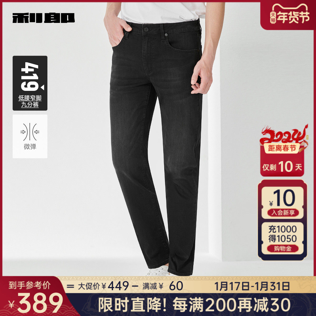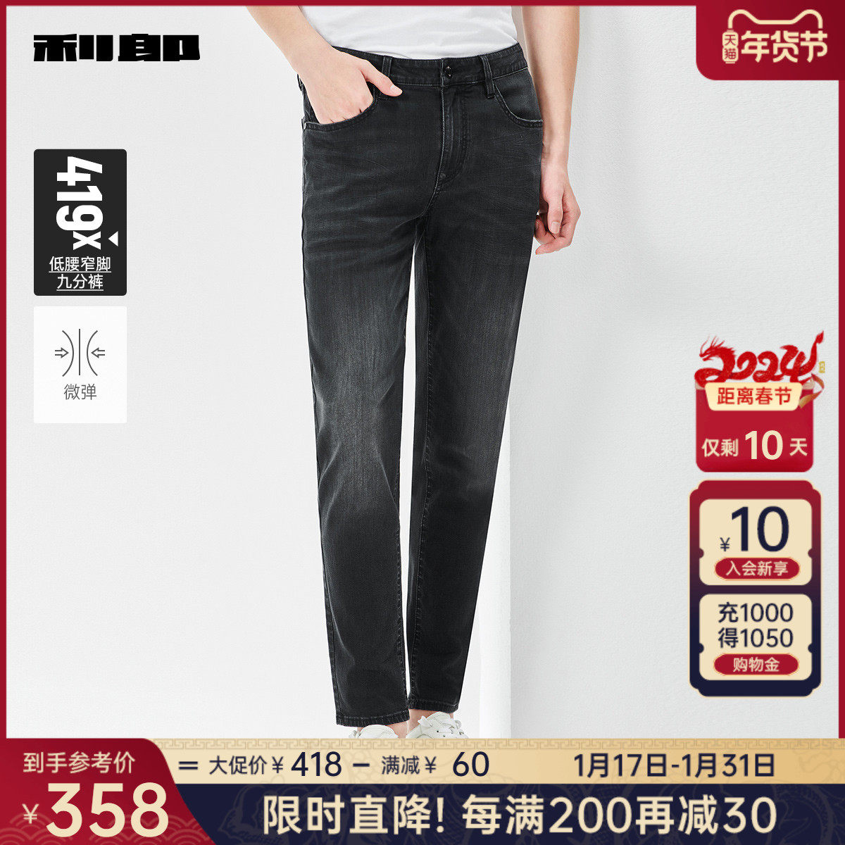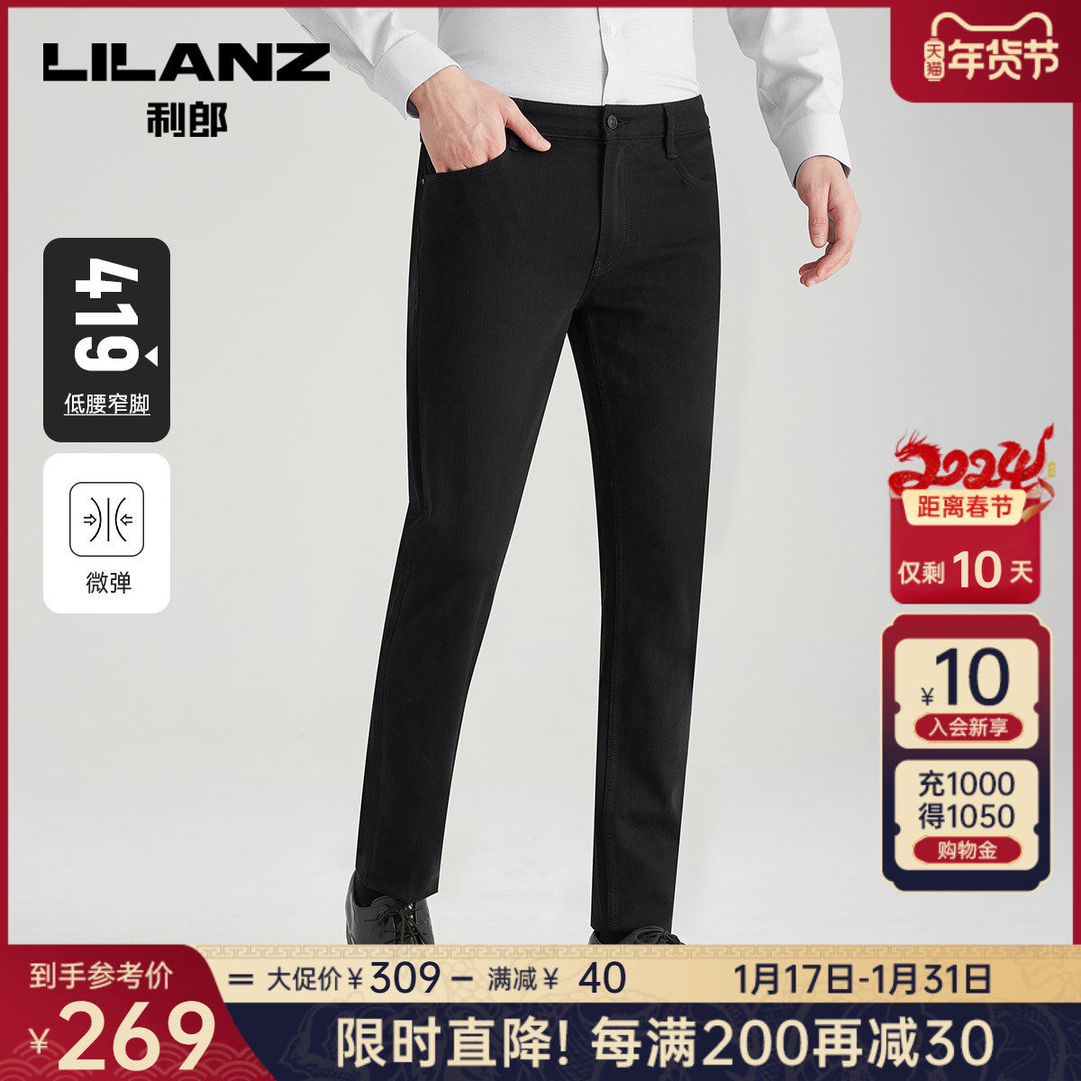 【科技黑+万向弹面料】利郎男士牛仔裤春季弹力中腰休闲百搭裤子