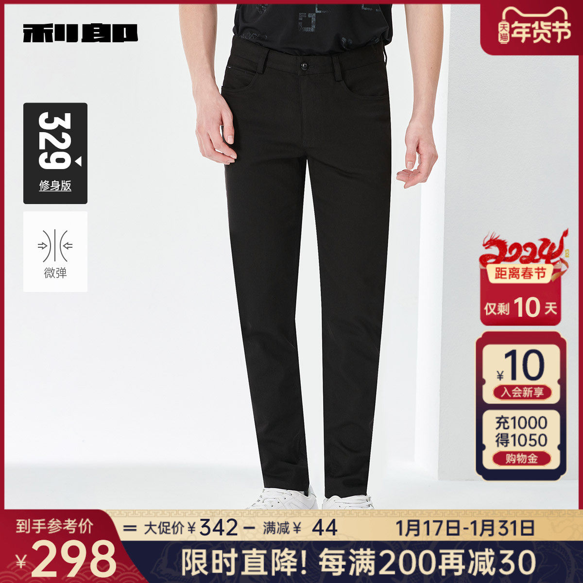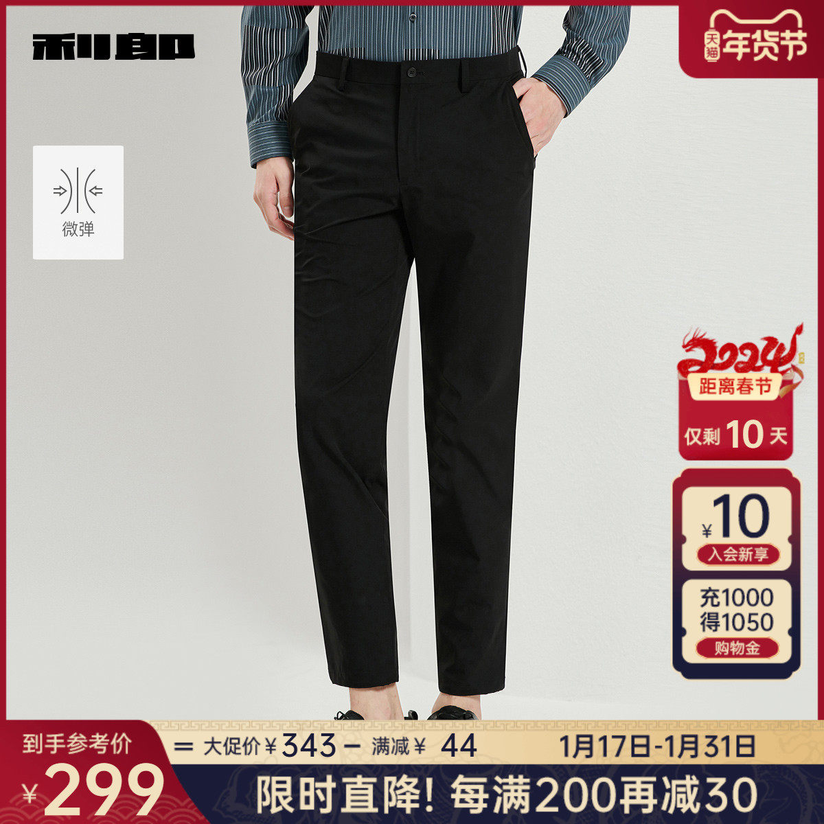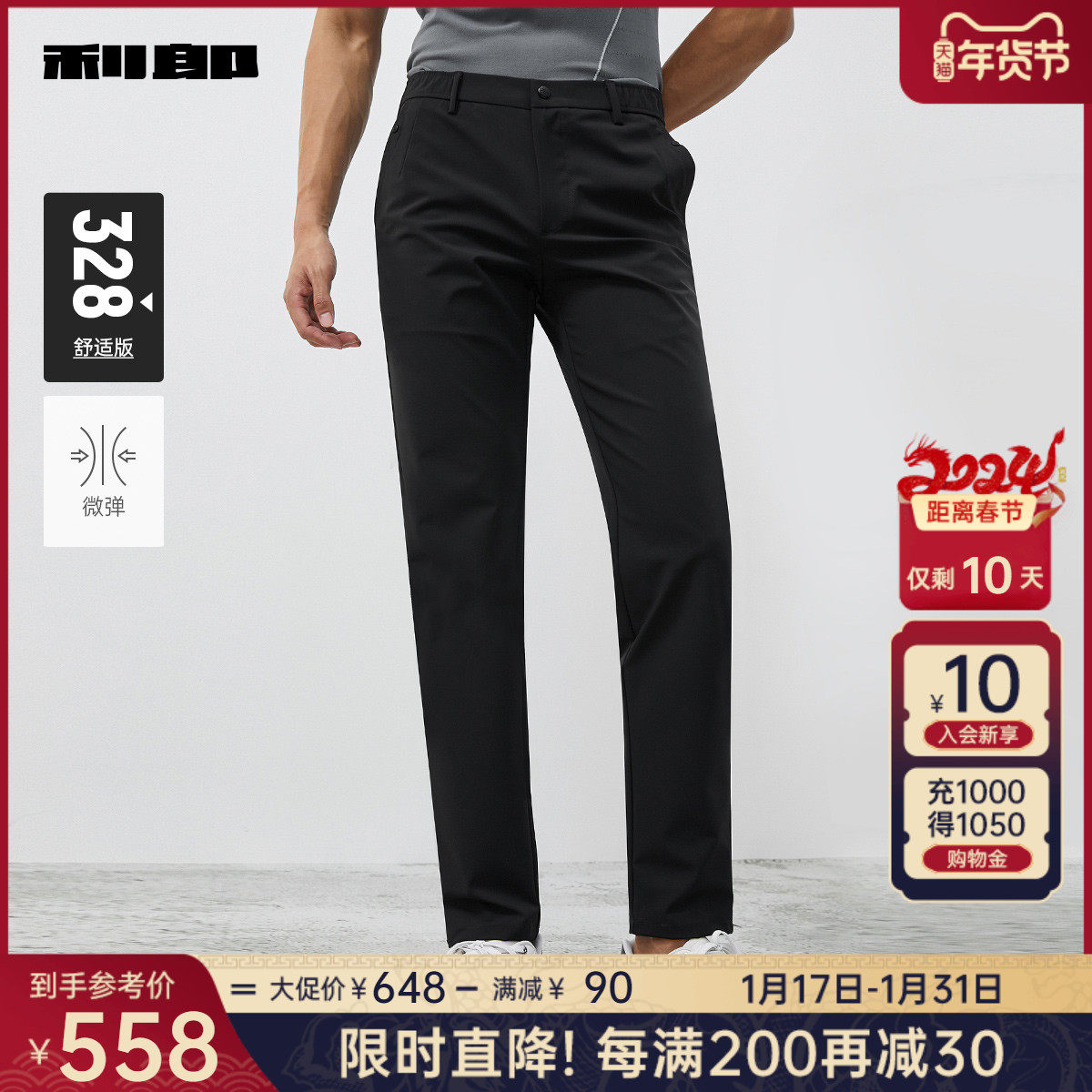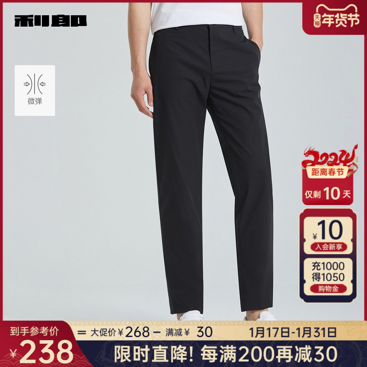 利郎官方 休闲裤男2024春商务黑色舒适合体男士弹力轻薄裤子裤装