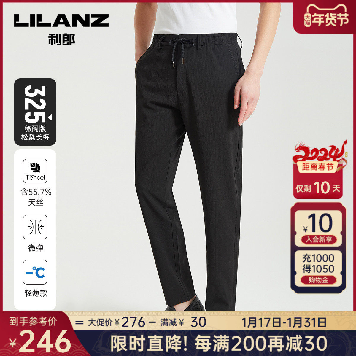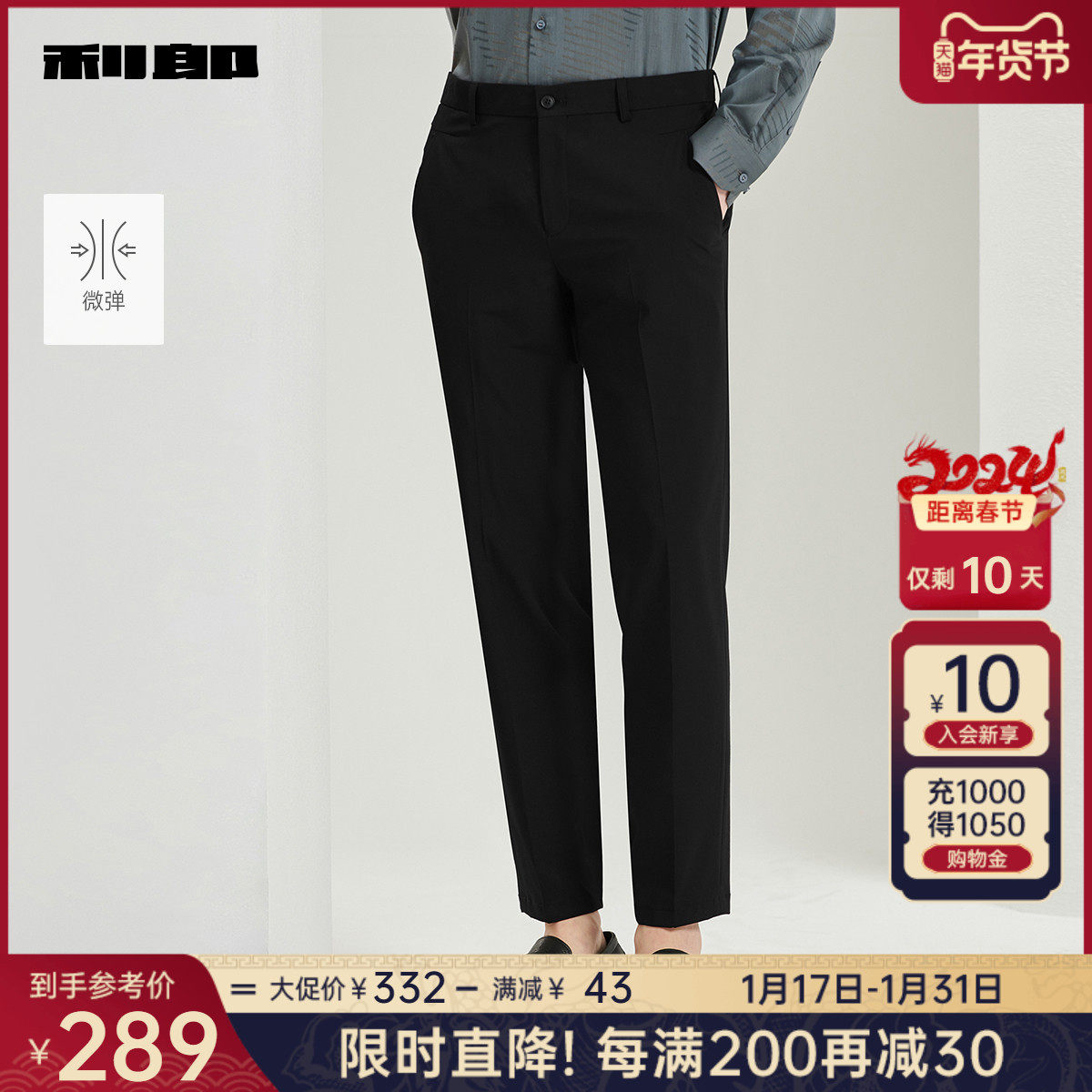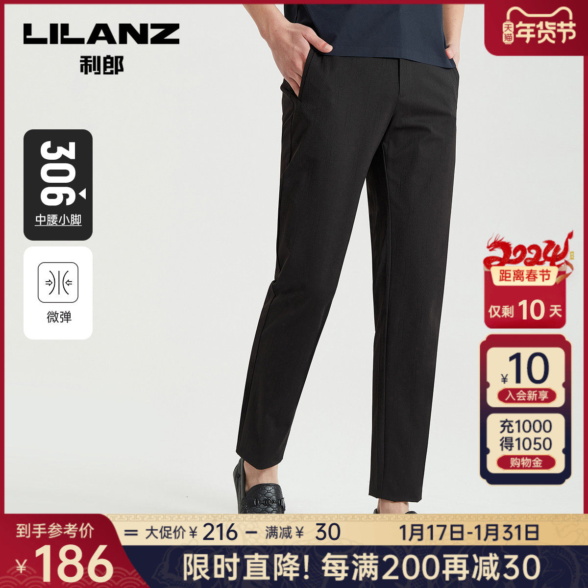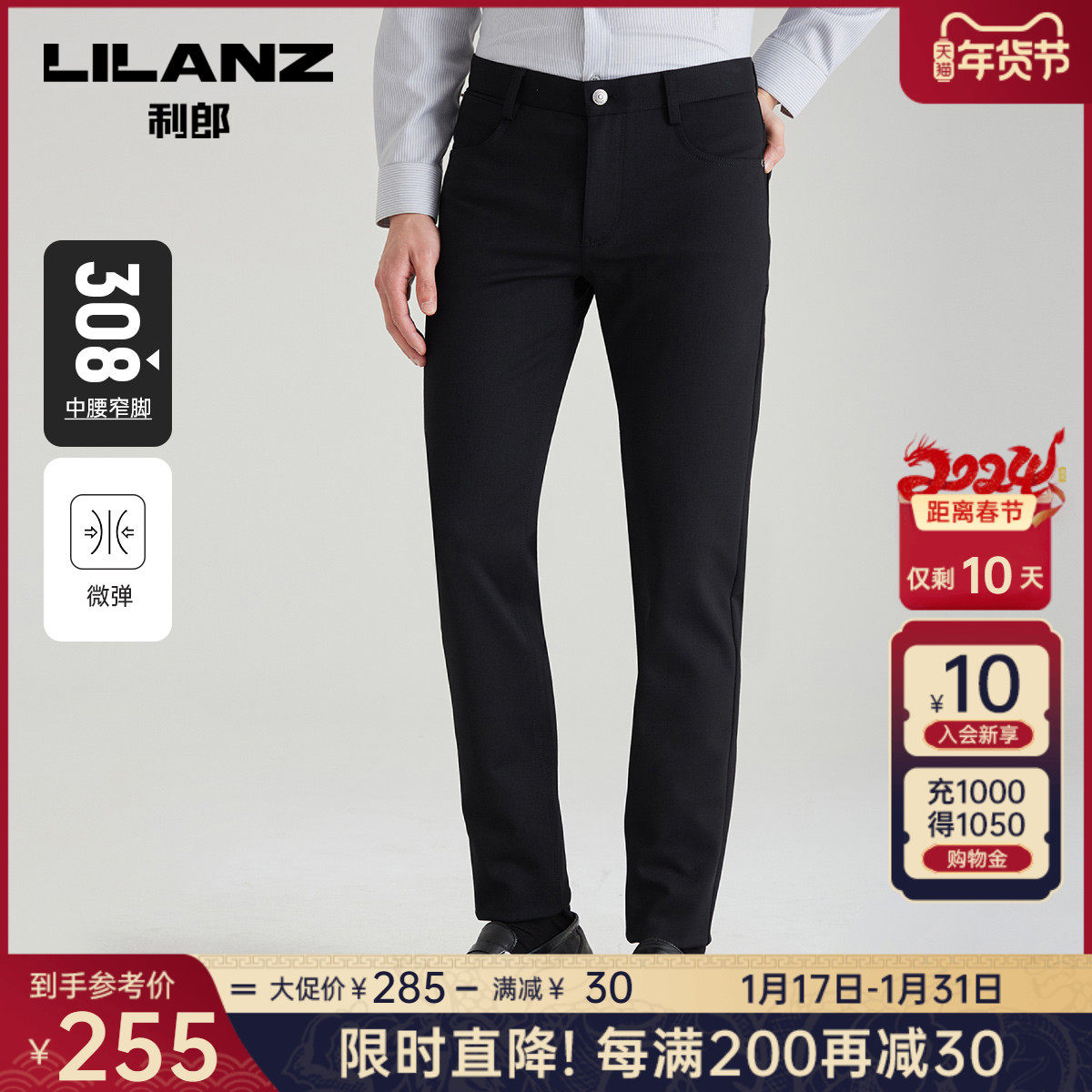 利郎官方 休闲裤男2024春商务黑色舒适合体男士弹力轻薄裤子裤装