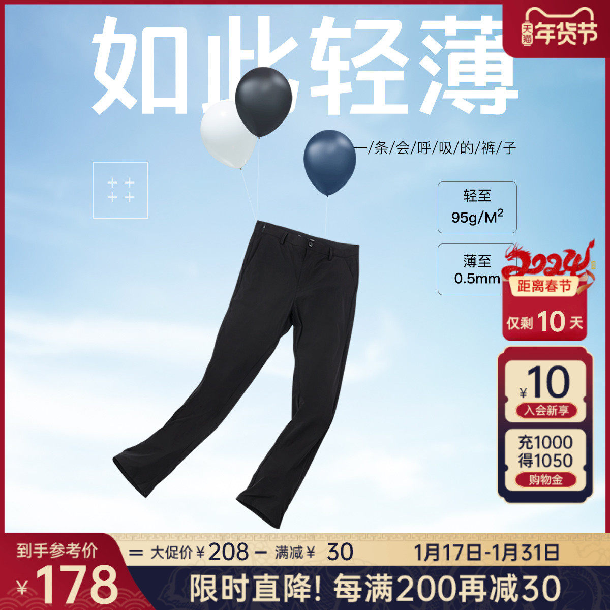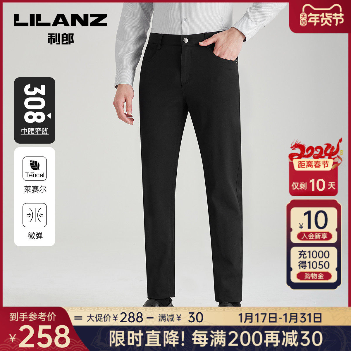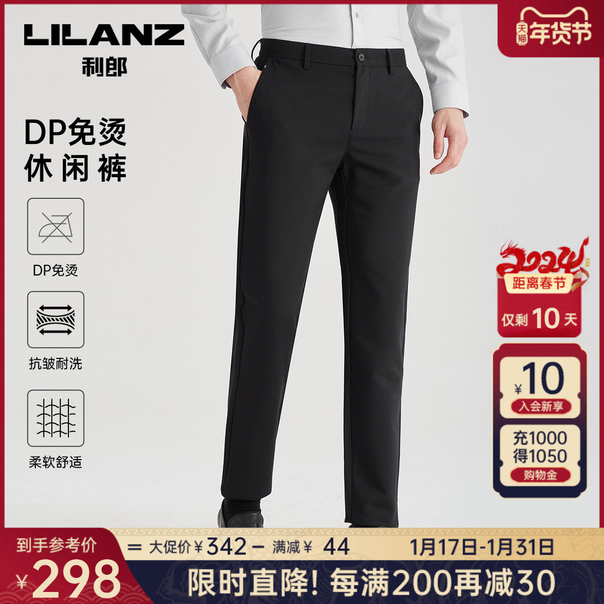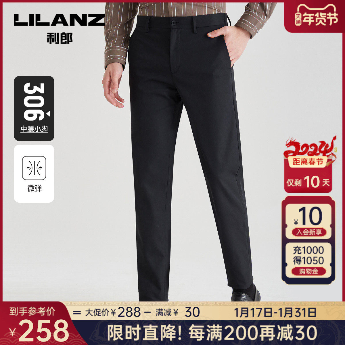 利郎官方 休闲裤男2024春商务黑色舒适合体男士弹力轻薄裤子裤装