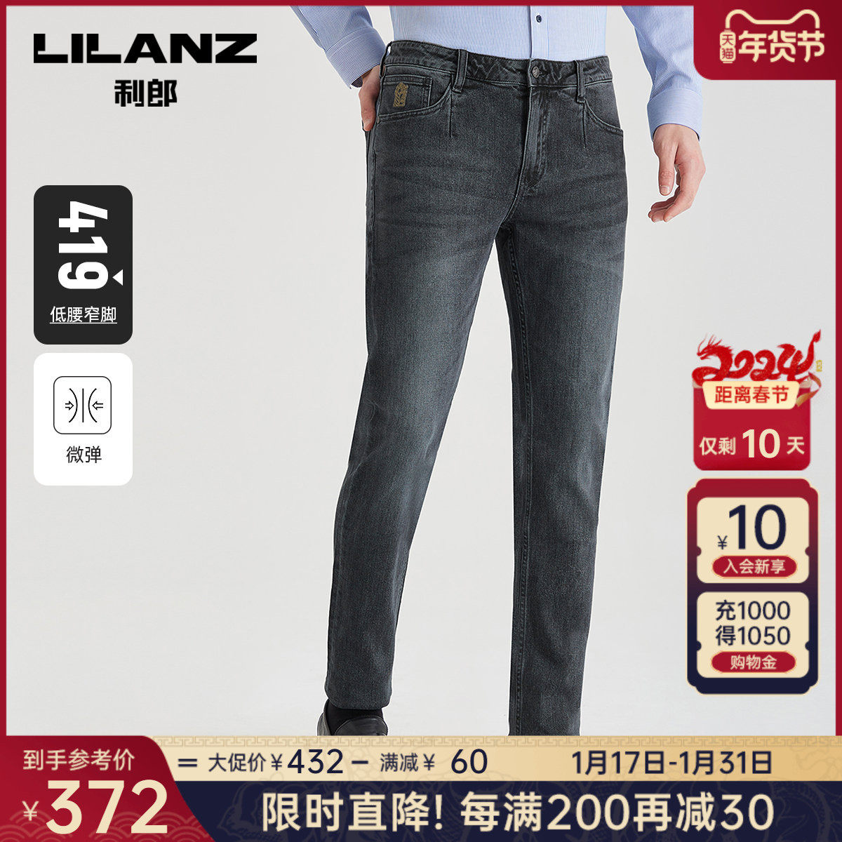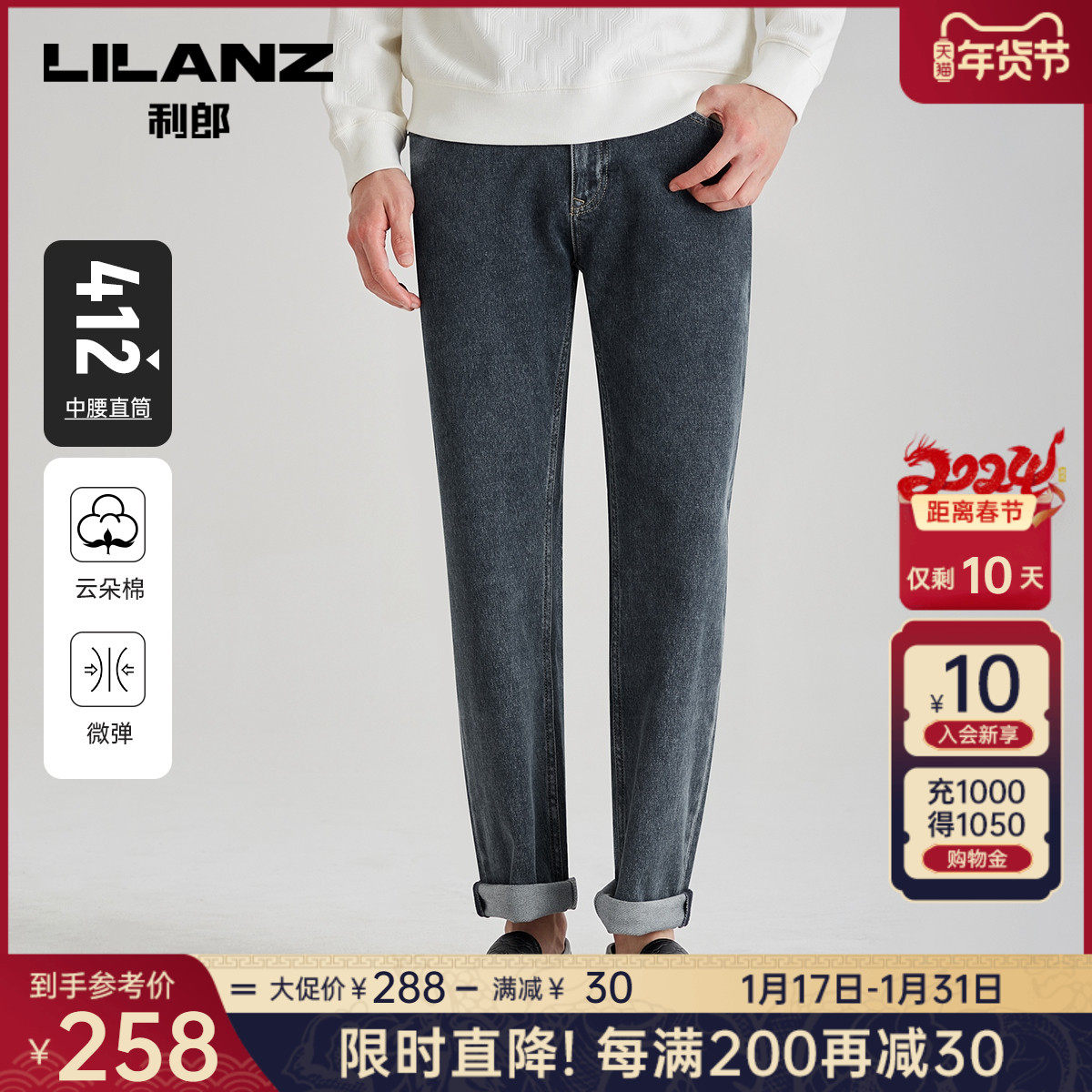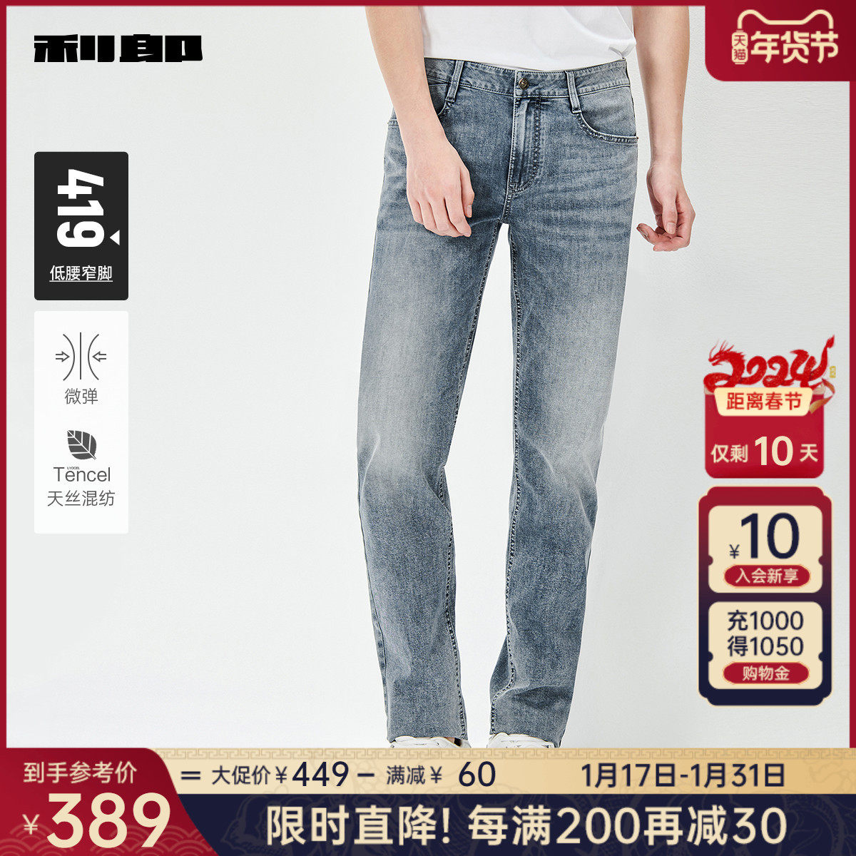【莱赛尔】利郎官方 牛仔裤男2024春商务休闲水洗磨白男士裤子