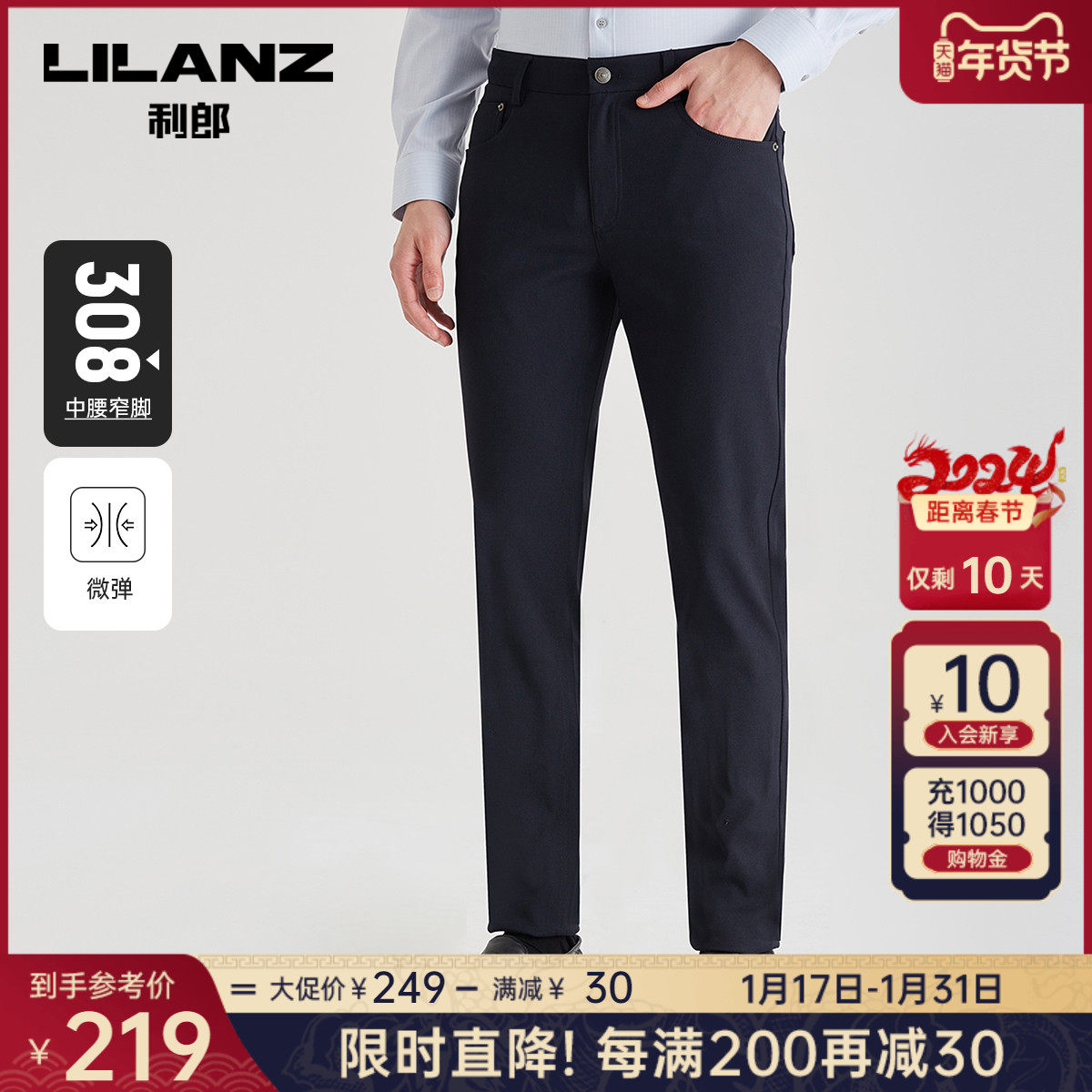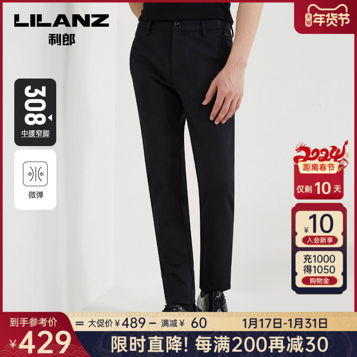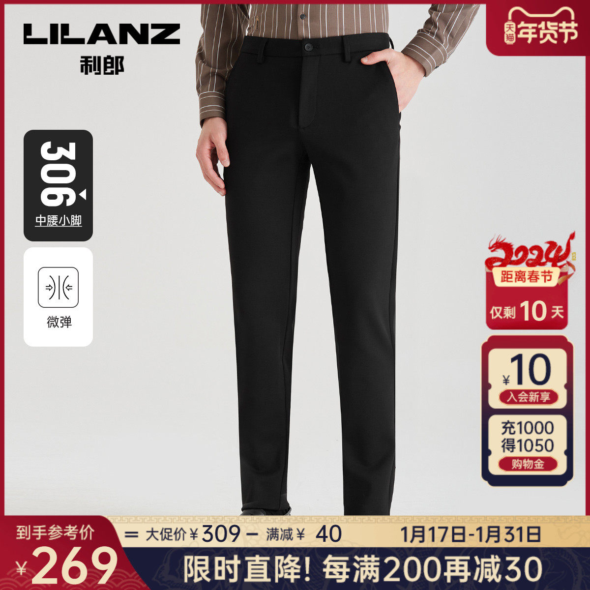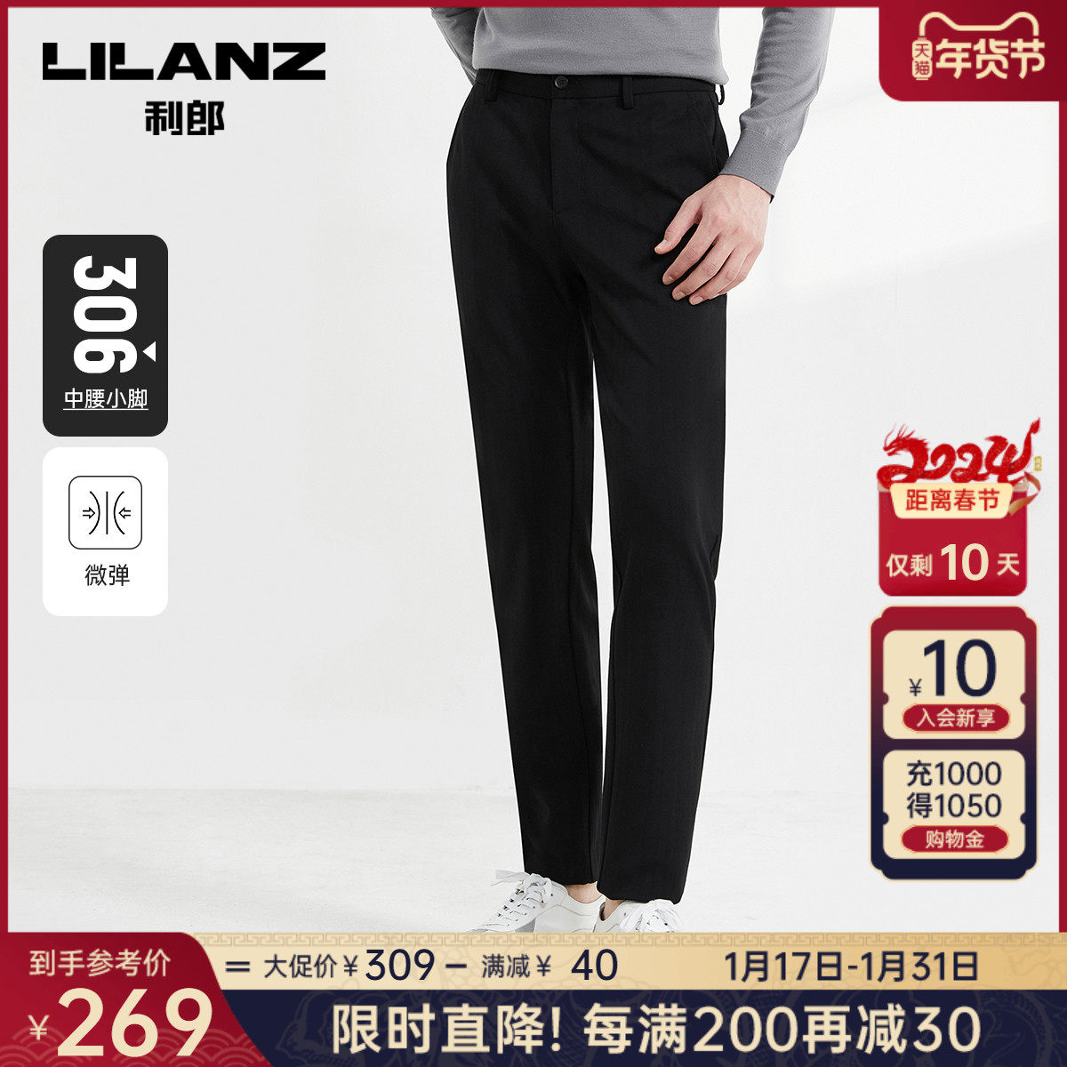 利郎官方 休闲裤男2023秋商务休闲黑色中腰小脚男士修身弹力裤子