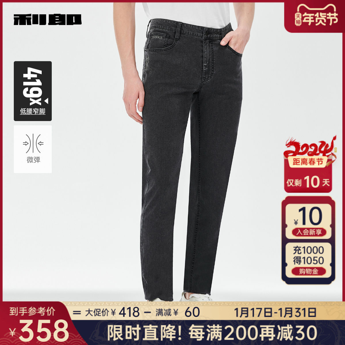 利郎官方 牛仔裤男2024春商务休闲水洗磨白刺绣男士低腰小脚裤子