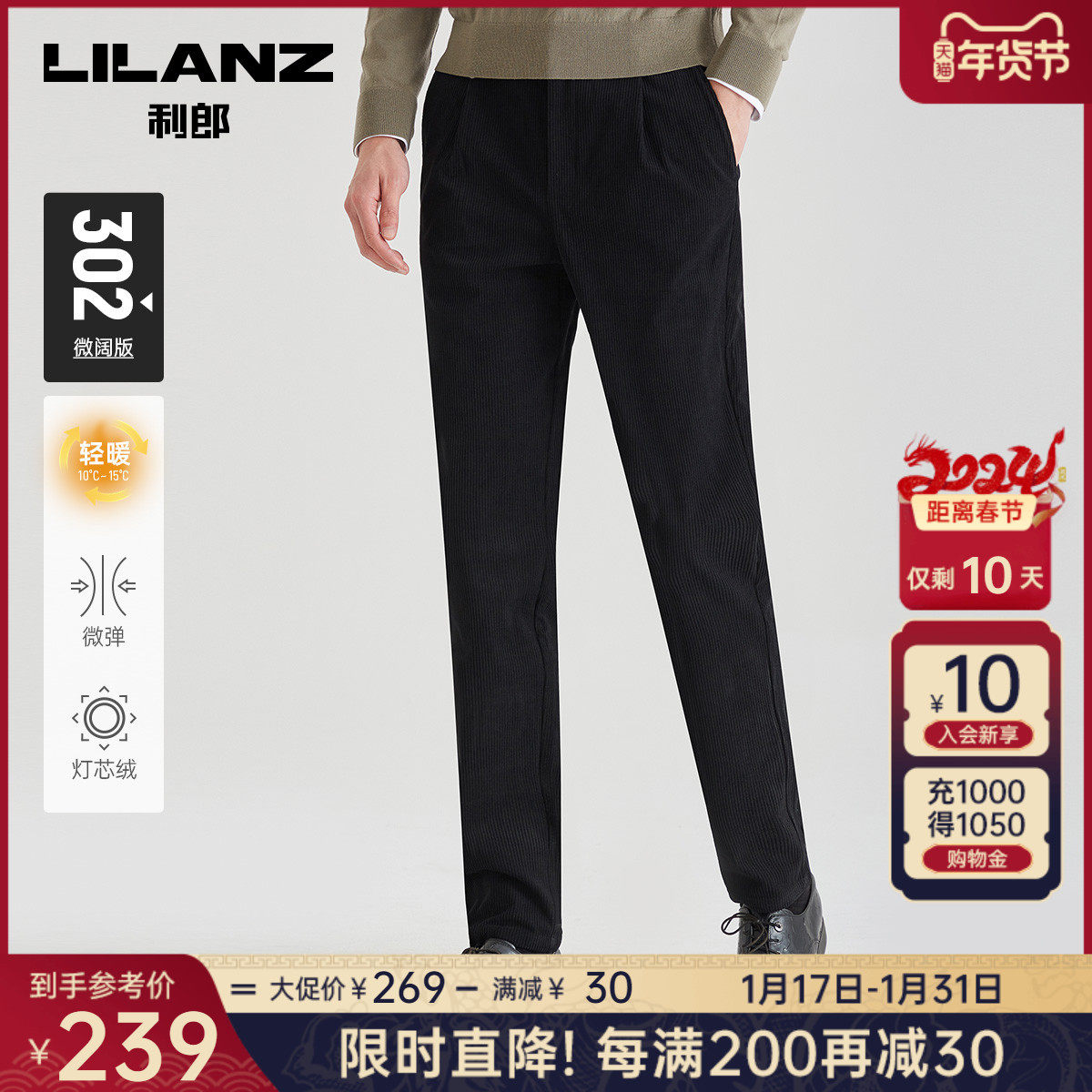 【灯芯绒】利郎官方 休闲裤男士2023冬季商务宽松弹力黑色裤子男