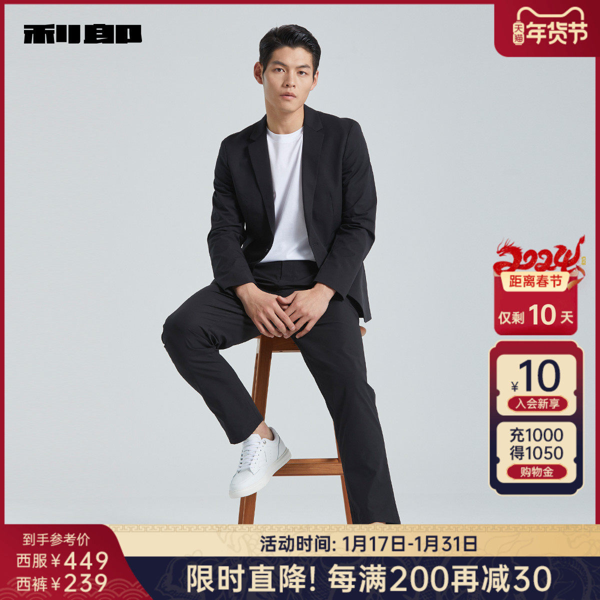 利郎官方 休闲裤男2024春夏删商务黑色斜插袋男士九分裤子