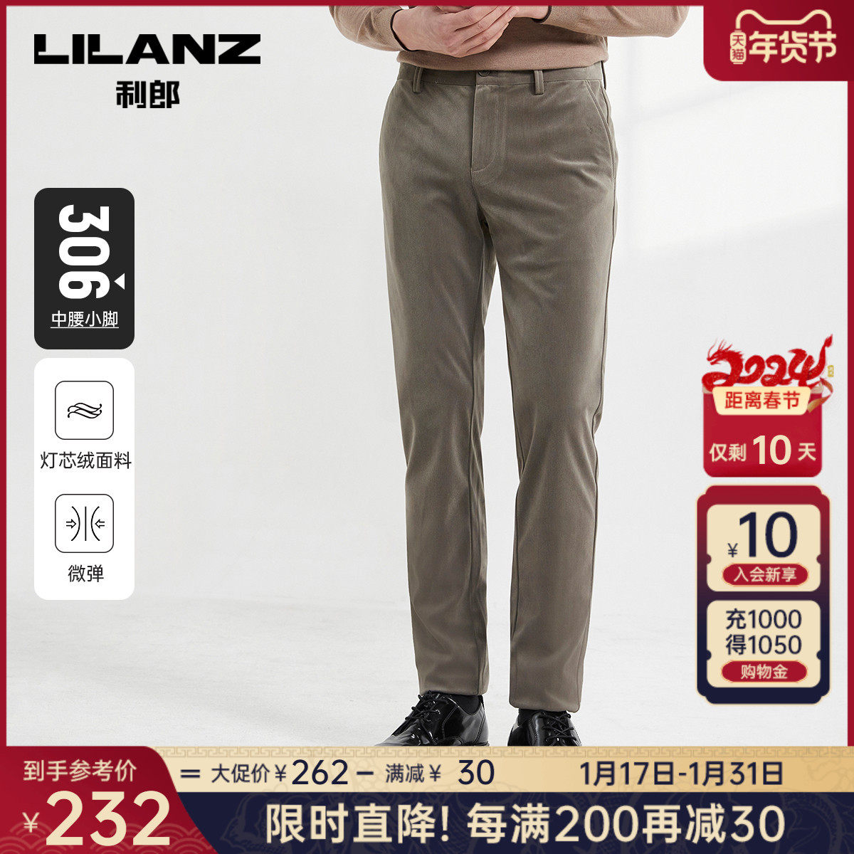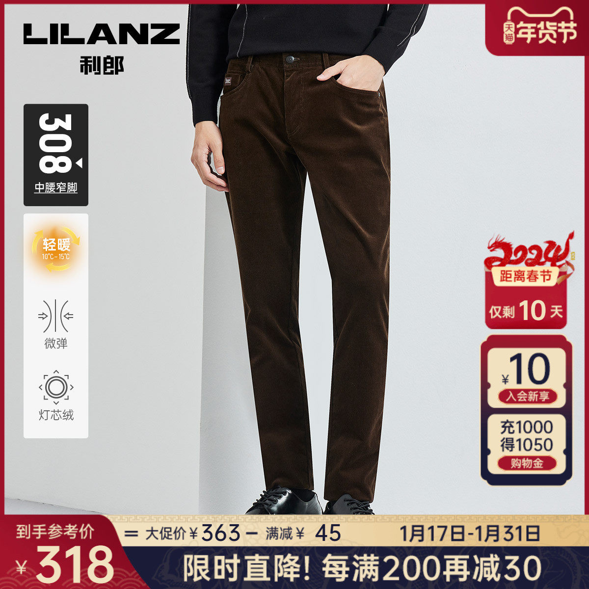 【灯芯绒】利郎官方 休闲裤男士商务中腰小脚裤2023冬弹力裤子男