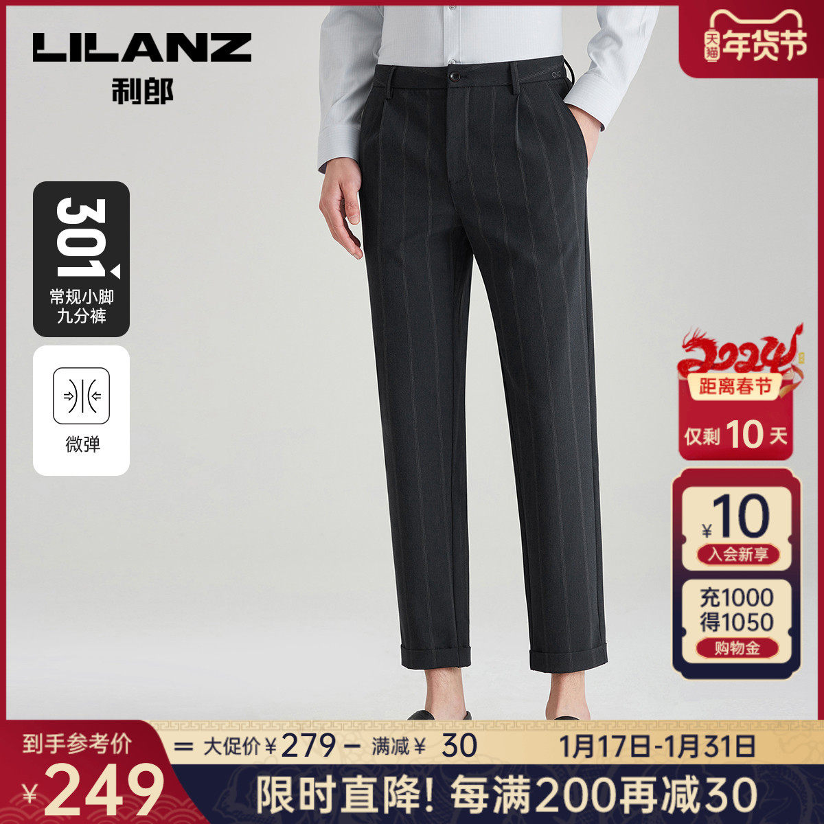 【阔腿宽松】利郎官方 九分休闲裤男士条纹夏季高端男裤锥形裤子