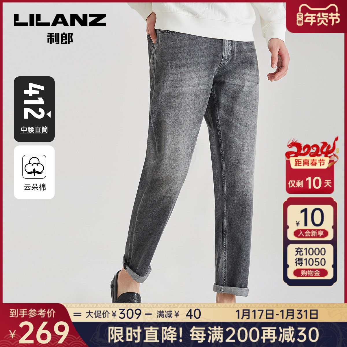 【云朵棉】利郎官方牛仔裤男2023秋商务休闲水洗男士中腰直筒裤子