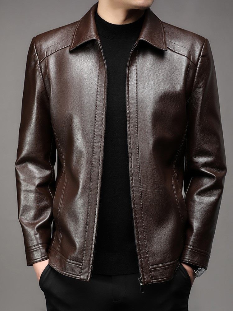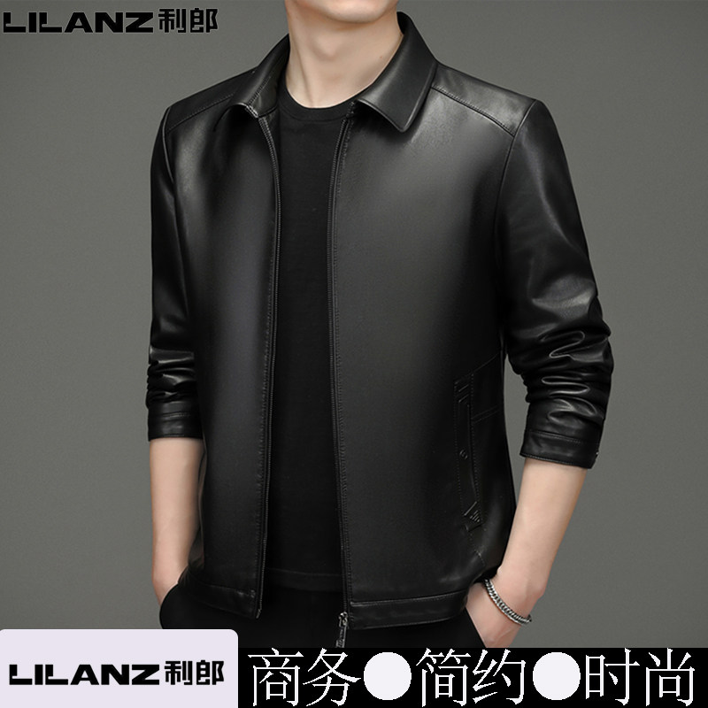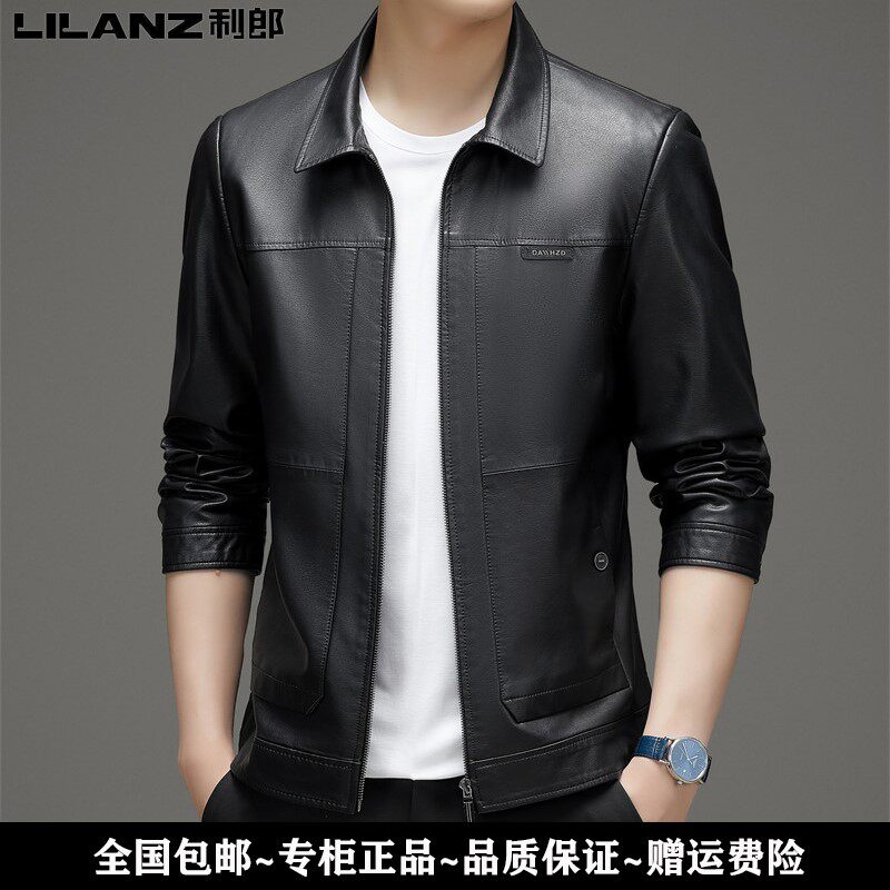 利郎真皮皮衣春秋男士绵羊皮薄款爸爸中年宽松翻领加绒皮夹克外套