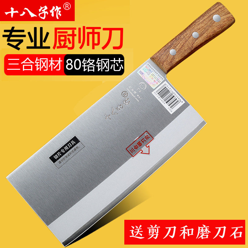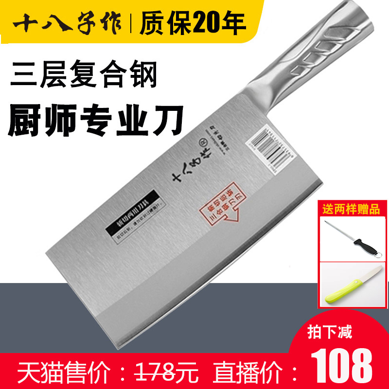 十八子作菜刀厨师专用饭店三合钢斩切两用三层复合钢切菜刀家用