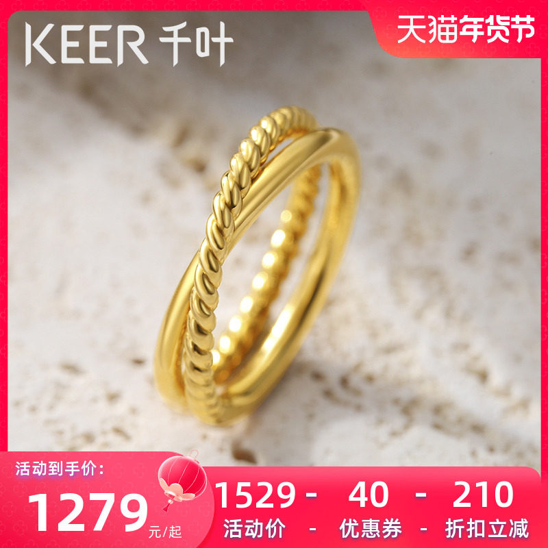 千叶珠宝5D麻花黄金戒指女足金素圈叠搭手饰尾戒新年礼物送女友