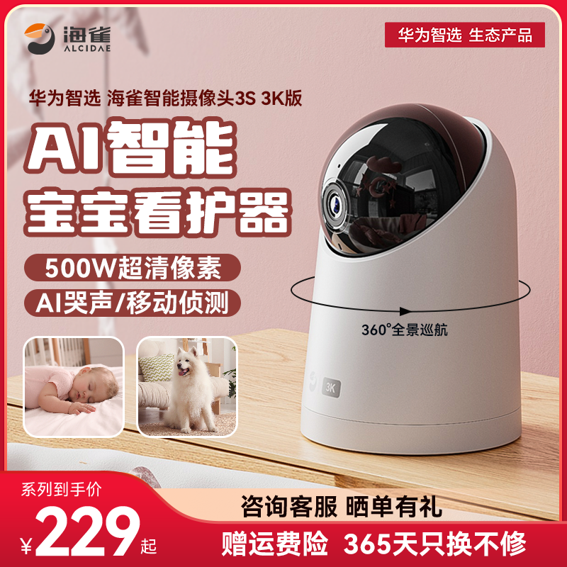 华为智选海雀智能摄像头家用室内婴儿监护器儿童看护宝宝远程手机监控360度全景摄影头无线wifi可连手机高清