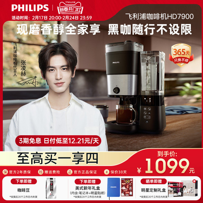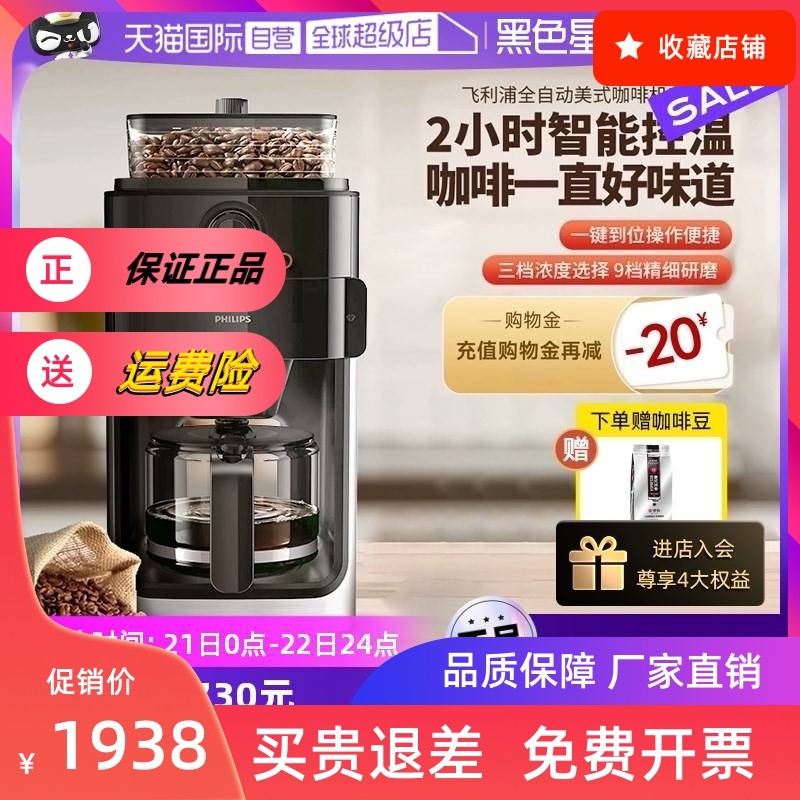 【新品】飞利浦美式咖啡机HD7900家用便携全自动小型带研磨双豆仓