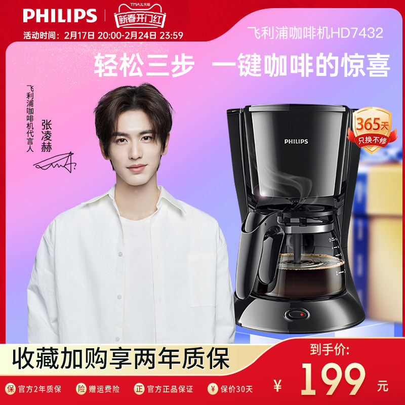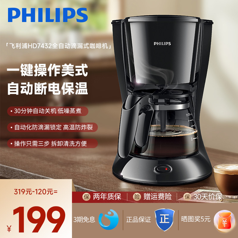 飞利浦HD7432美式咖啡机小型家用办公室复古便携式全自动咖啡机