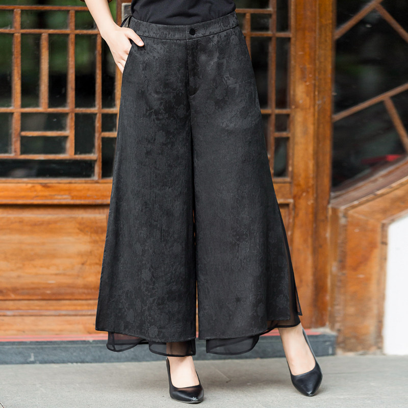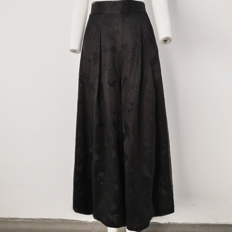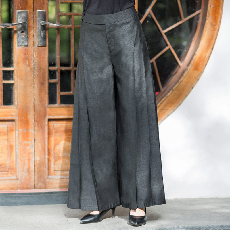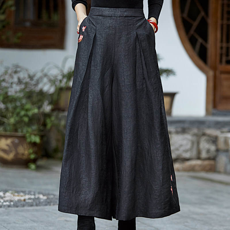 华族经典休闲裤百搭中式复古黑色显瘦舒适透气旗袍阔腿裙裤中长款