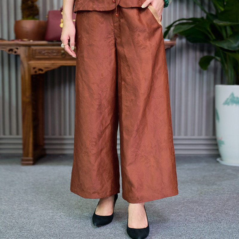 华族经典阔腿裤女百搭显瘦气质款红云纱桑蚕丝中式裤子花落西窗