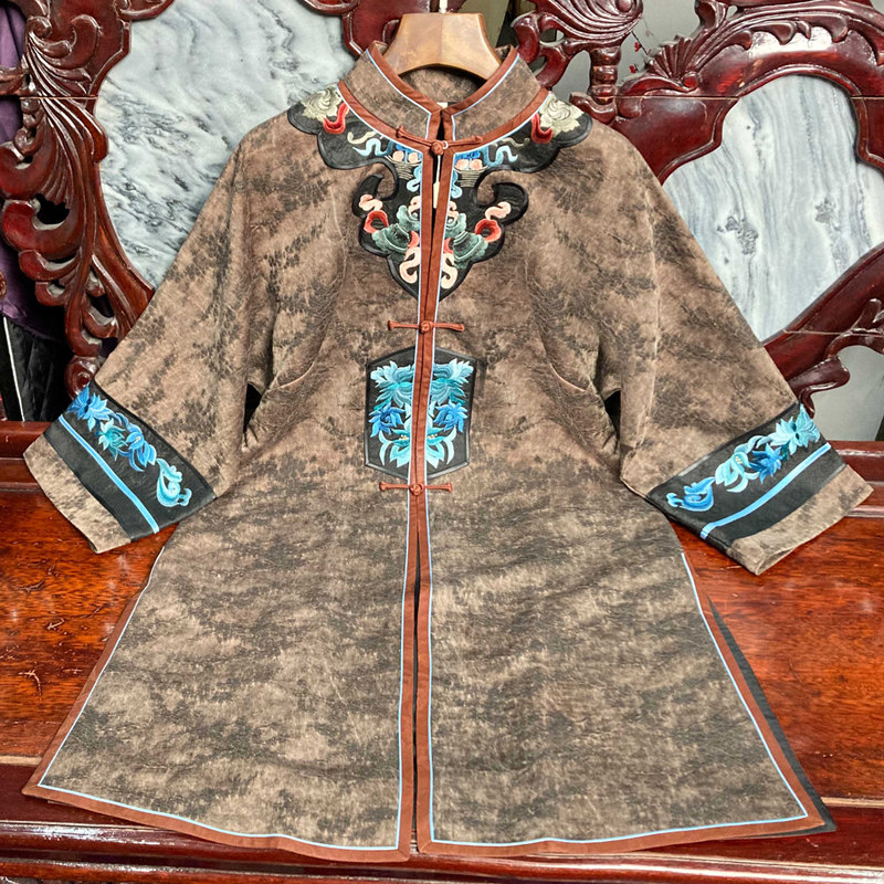 华族经典琴瑟和鸣新中式刺绣高端香云纱夹棉加厚风衣旗袍外套上衣