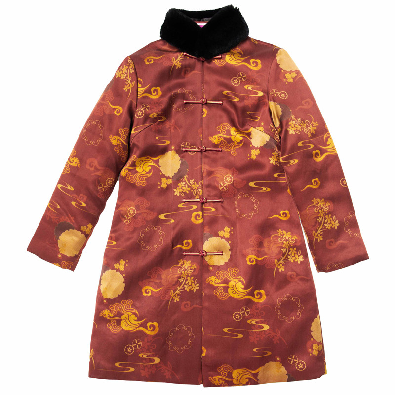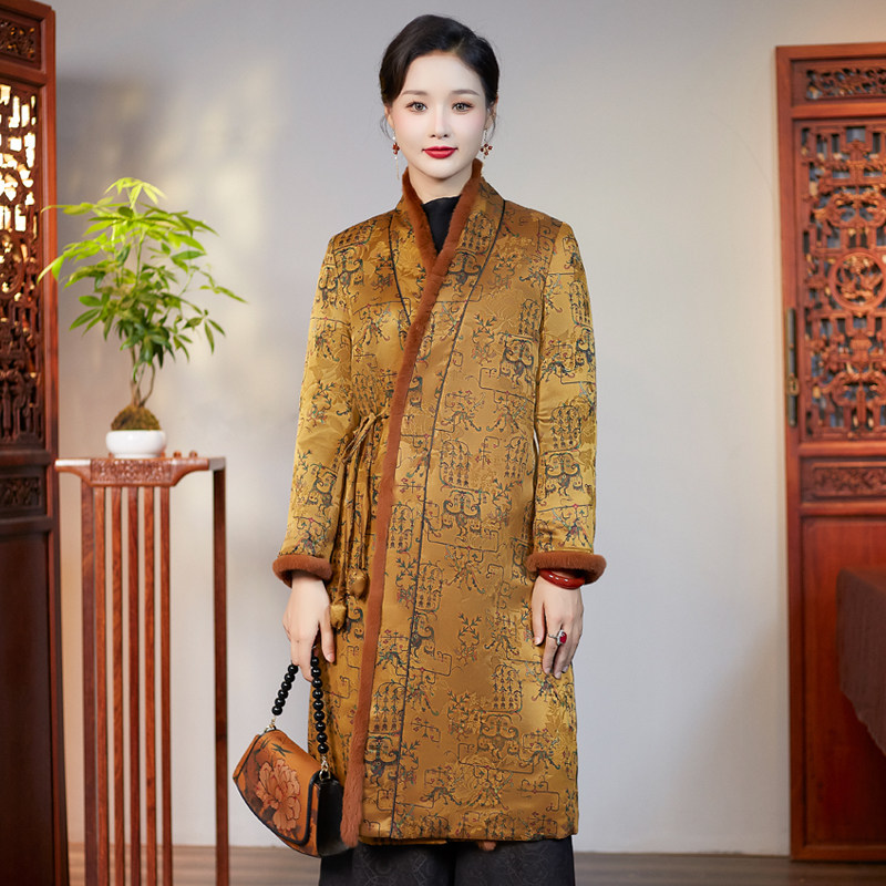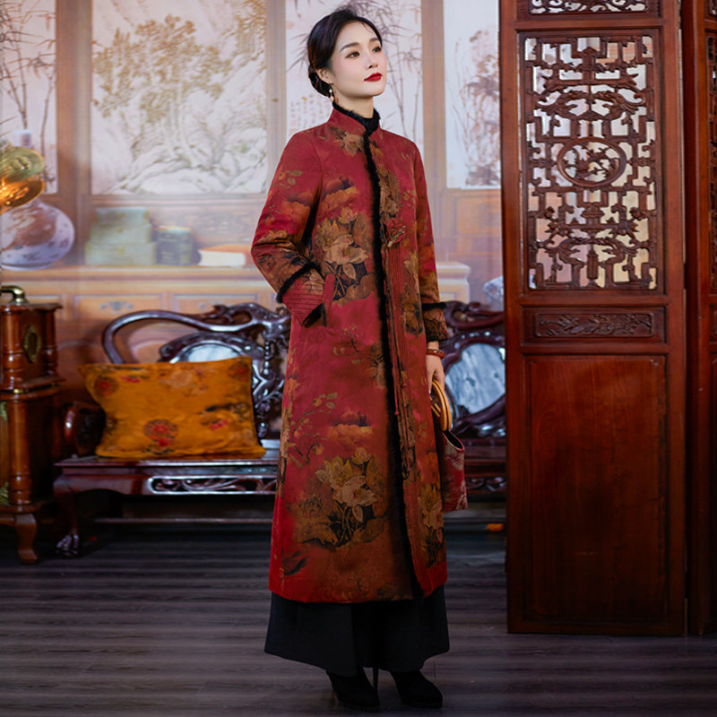 华族经典L-2309028香云纱改良旗袍中长款夹棉大衣外套加厚风衣冬