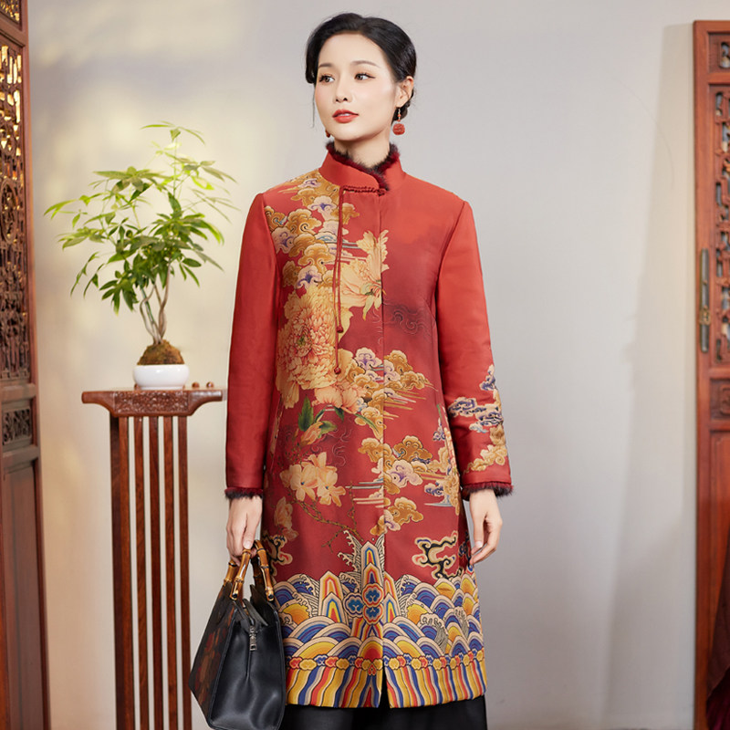 华族经典红尘画卷重工刺绣复古中式夹棉香云纱外套棉服上衣中长款
