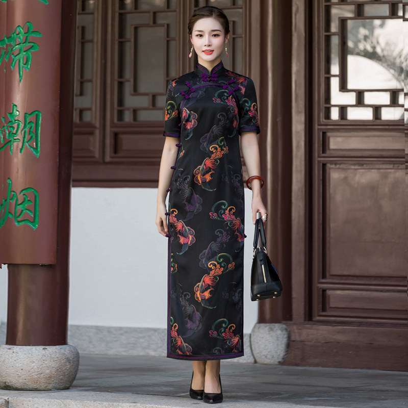 华族经典玉暖风情真丝香云纱复古中国风优雅改良旗袍连衣裙长款女