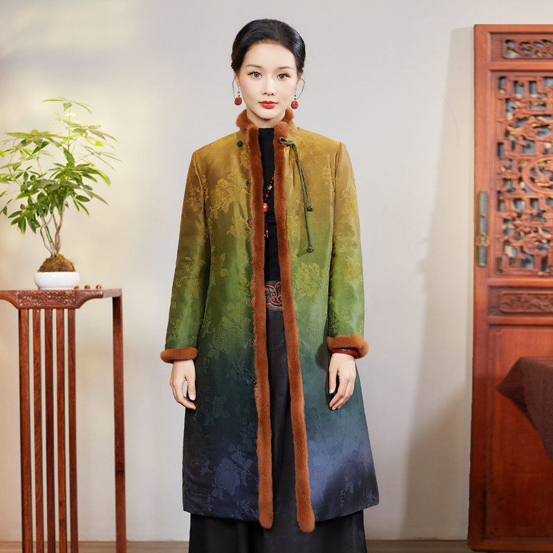 华族经典江涵秀色40姆米香云纱加厚国风毛领新年唐装外套中长款冬