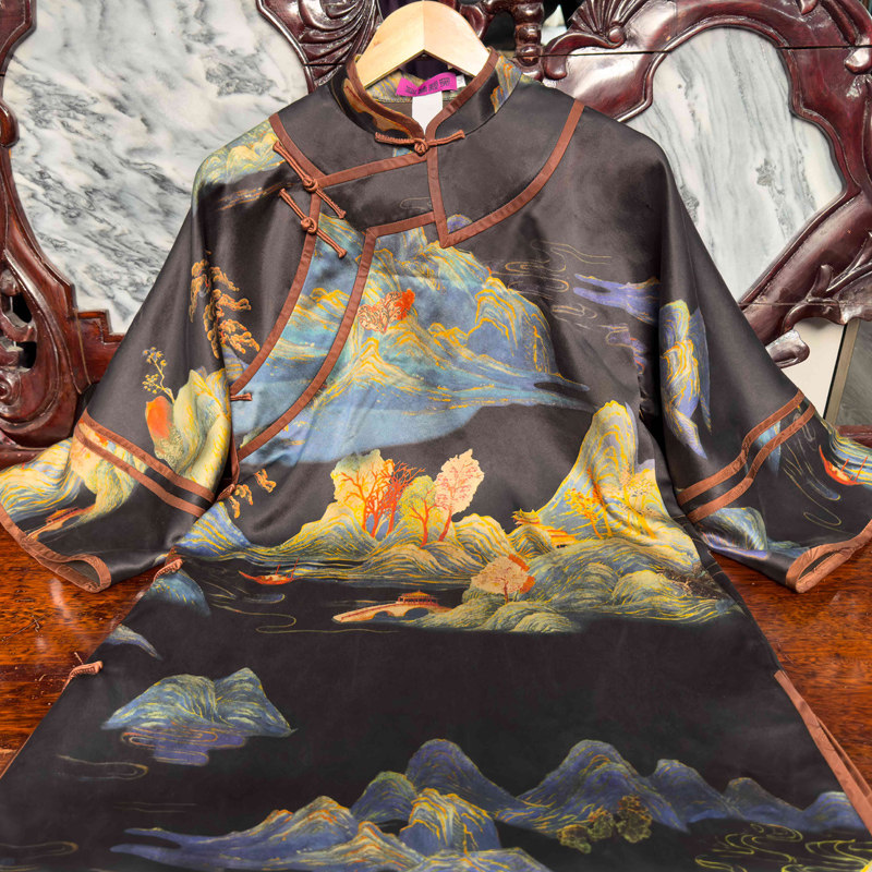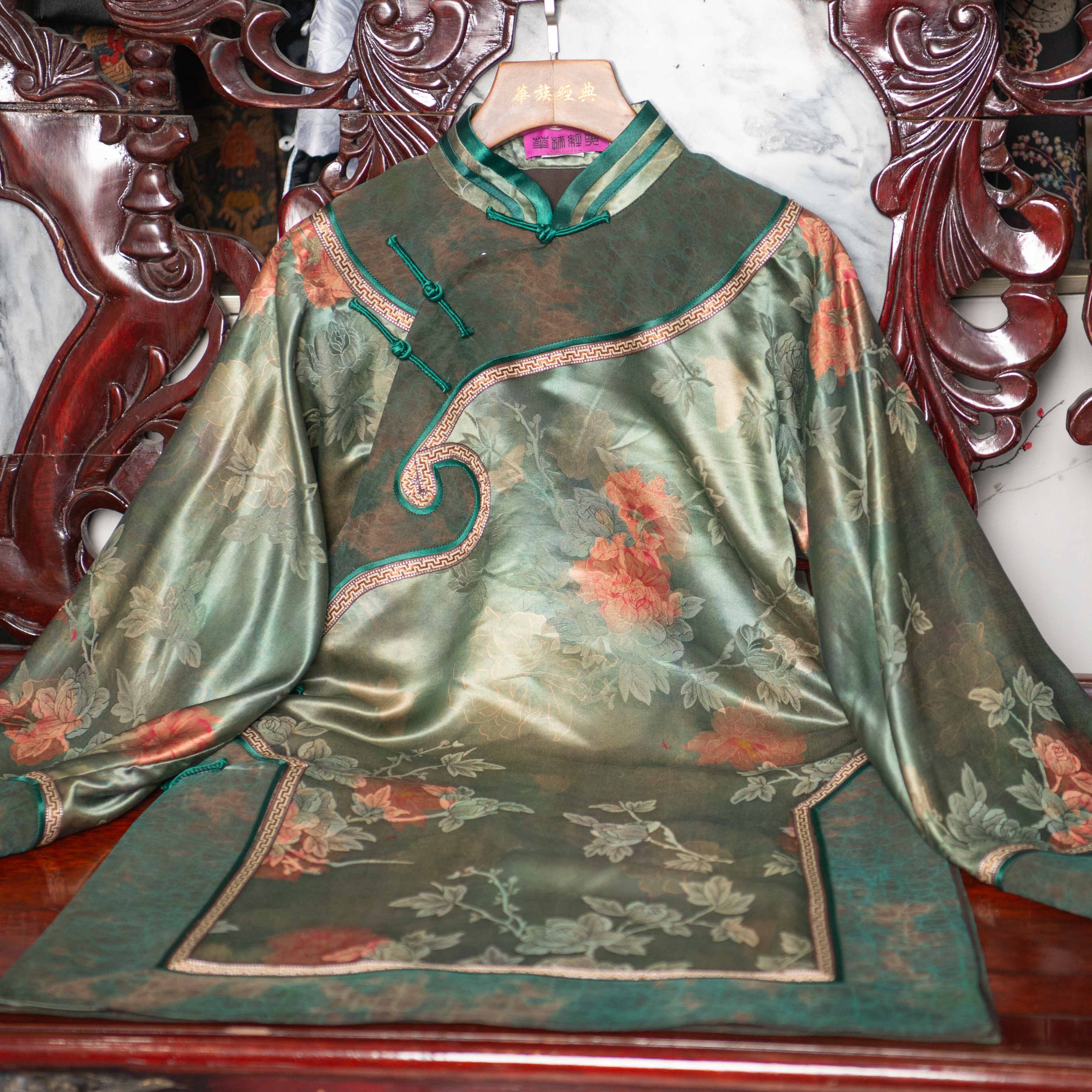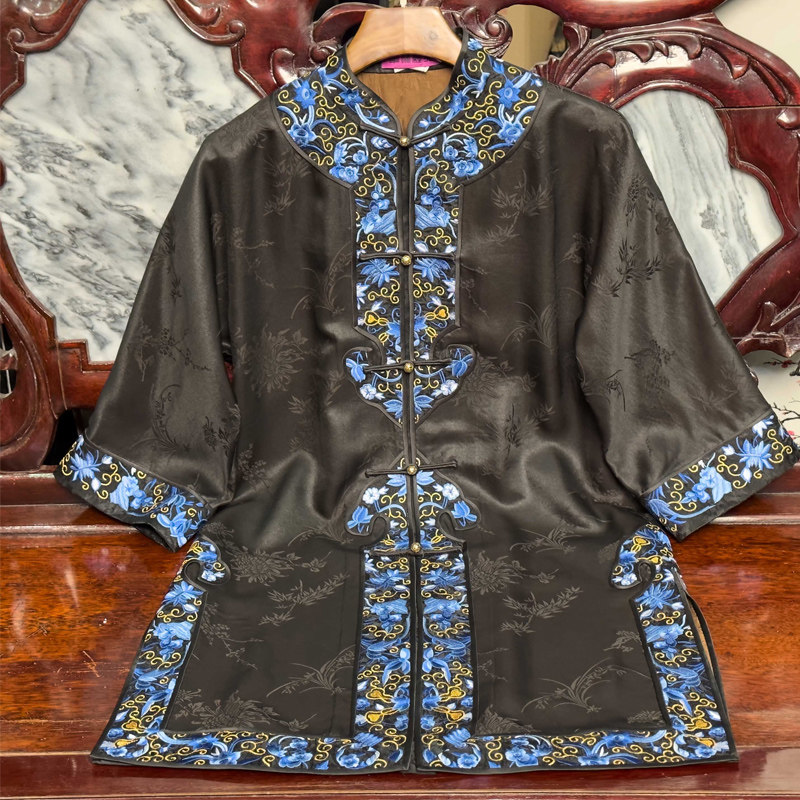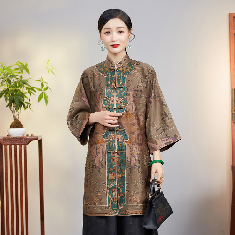 华族经典重缎香云纱国风高贵倒大袖盘扣太太服中长款上衣碧清池