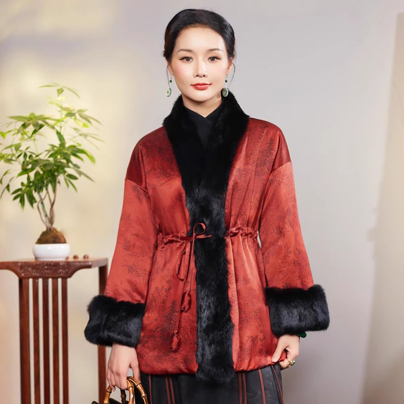 华族经典唐装女佳人40姆米重缎香云纱夹棉加厚兔毛中式上衣外套冬