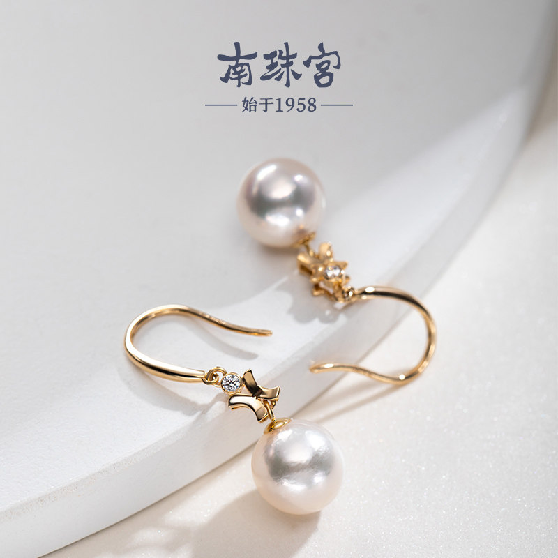南珠宫18K金钻石海水珍珠耳环 通勤百搭圆真珠职人耳钉 E187KN