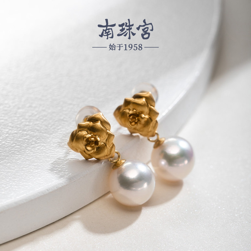 南珠宫18K金海水珍珠耳环 合浦南珠大圆国风磨砂古法双色 E201KN