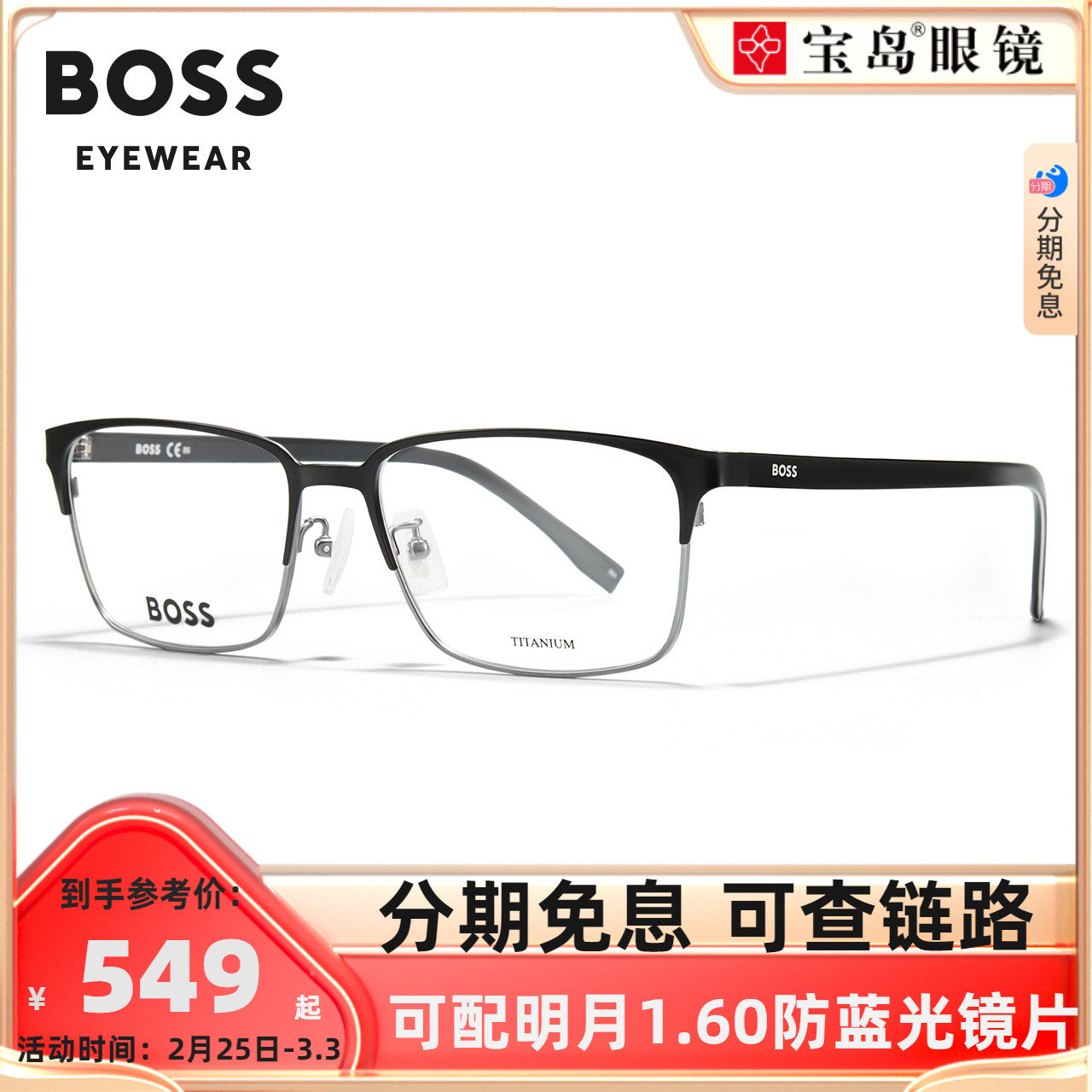HUGO BOSS眼镜框男钛合金镜架时尚商务黑框眼镜可配近视镜片0808