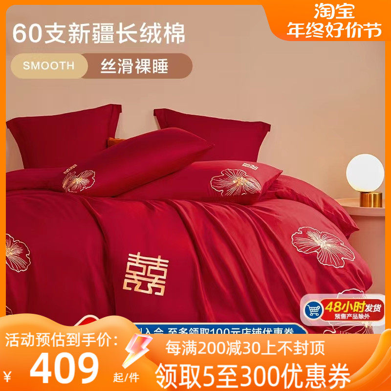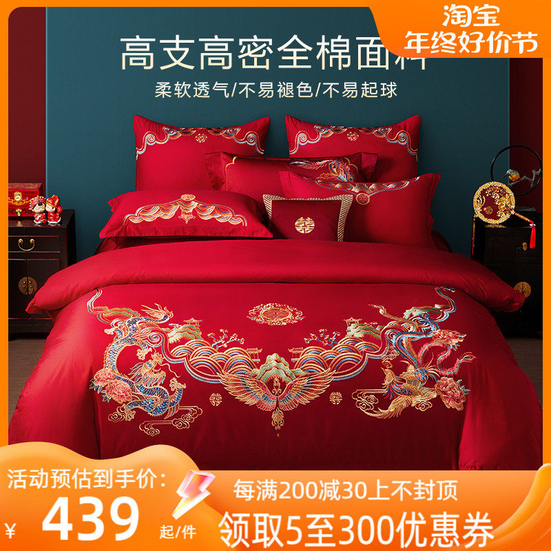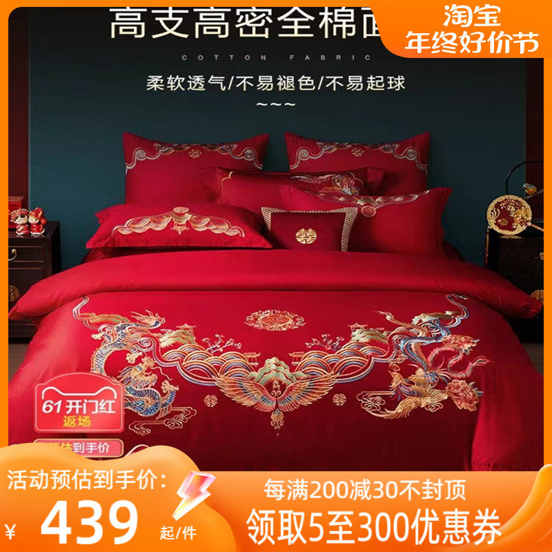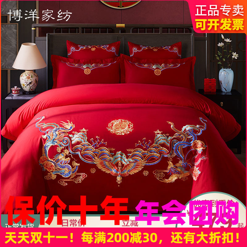 博洋婚庆四件套结婚大红床单床上用品喜被婚嫁婚床新婚房红色龙凤