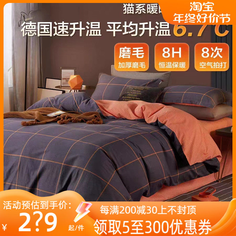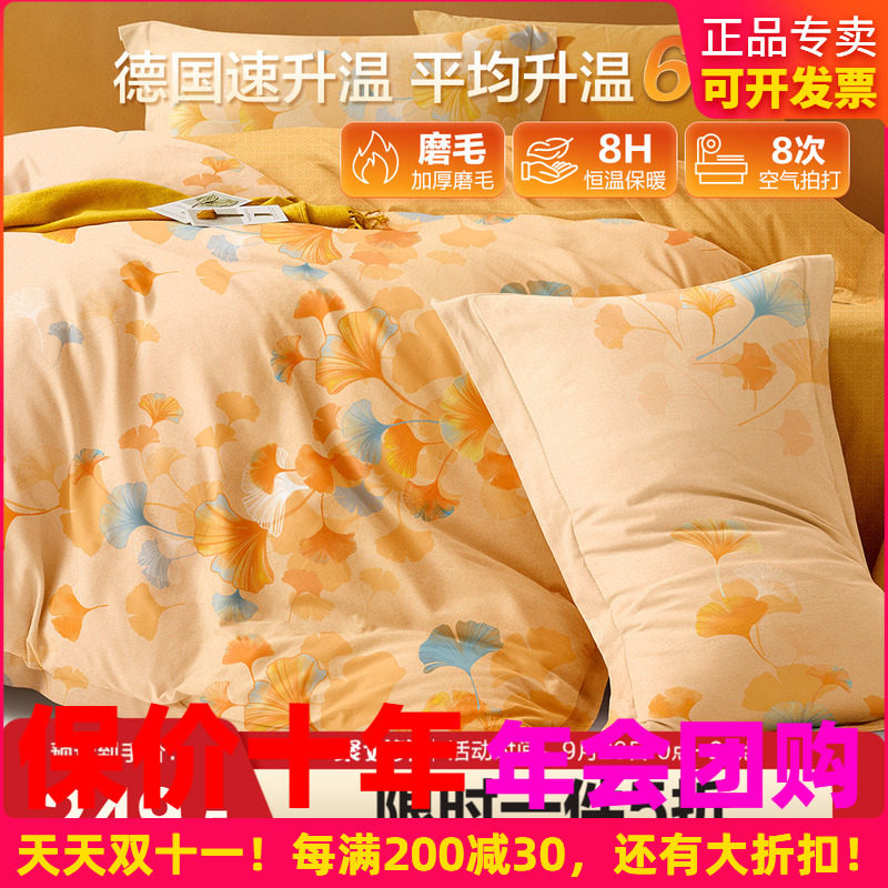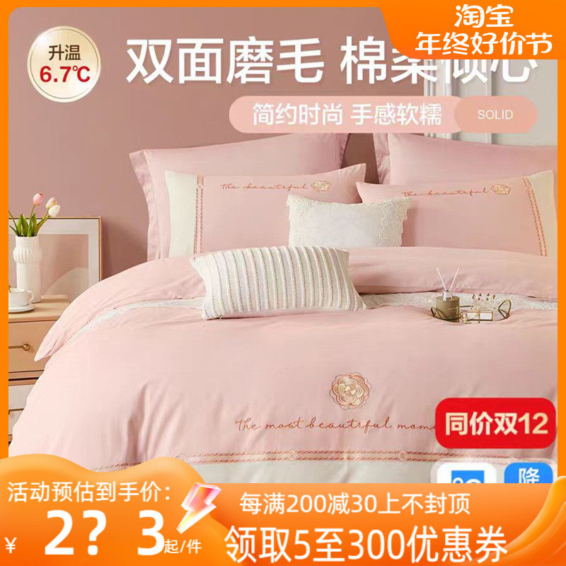 梦洁家纺纯棉磨毛三四件套秋冬季保暖床上用品套件加厚被套床单