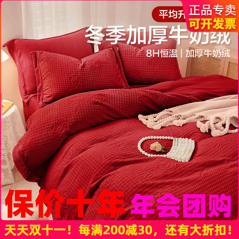 博洋婚庆雕花绒牛奶绒结婚四件套冬季加厚被套床单床上用品冬天