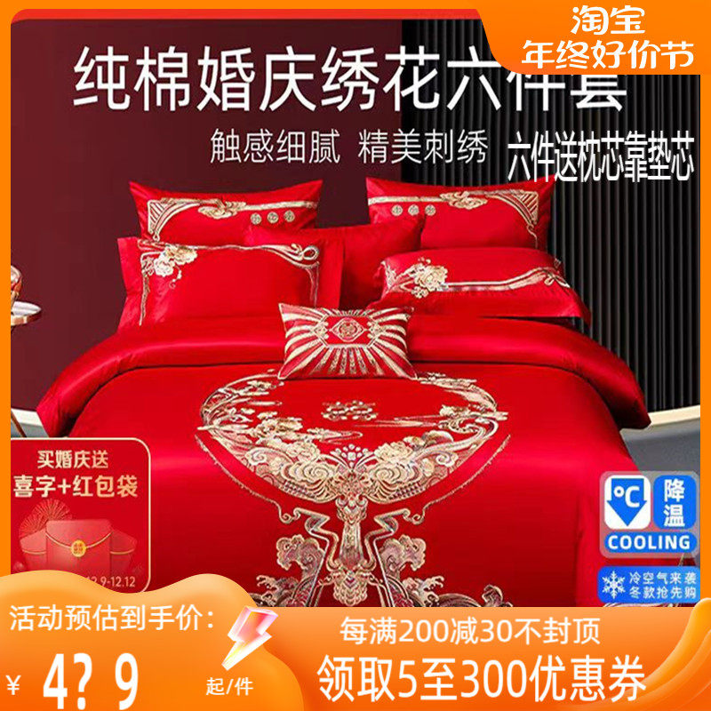 博洋家纺100支婚庆六件套结婚床上用品百子图四件套新婚红色大红
