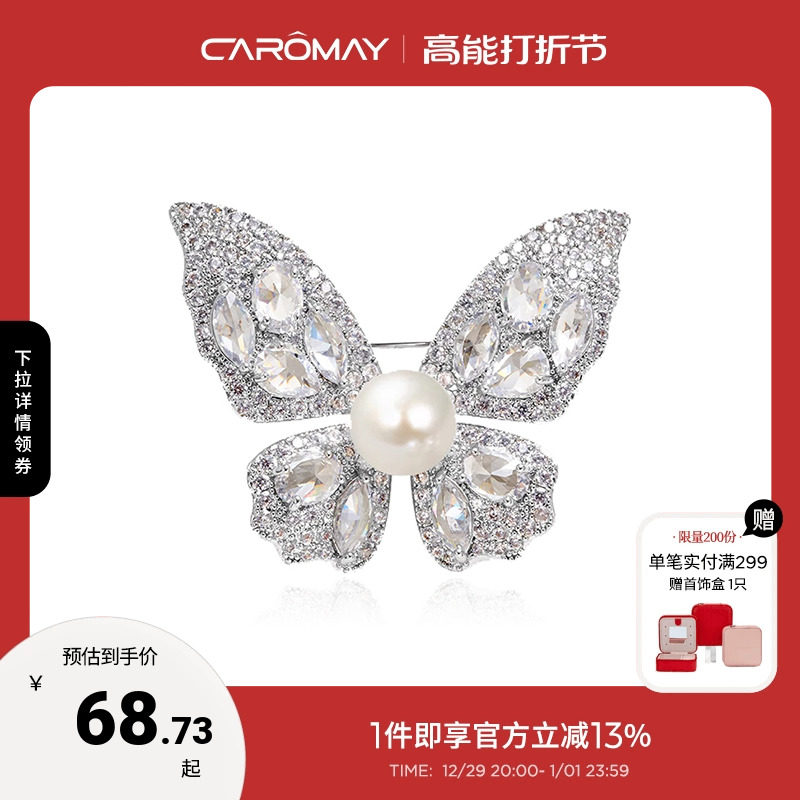 卡洛美闪耀人造锆石蝴蝶珍珠胸针女高档精致礼服别针西装大衣领针