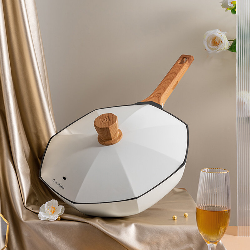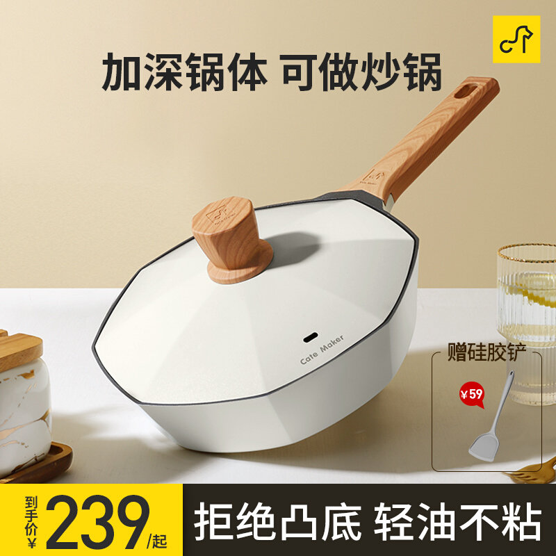 卡特马克枫叶不粘锅家用炒锅白色六角炒菜锅电磁炉燃气灶平底锅