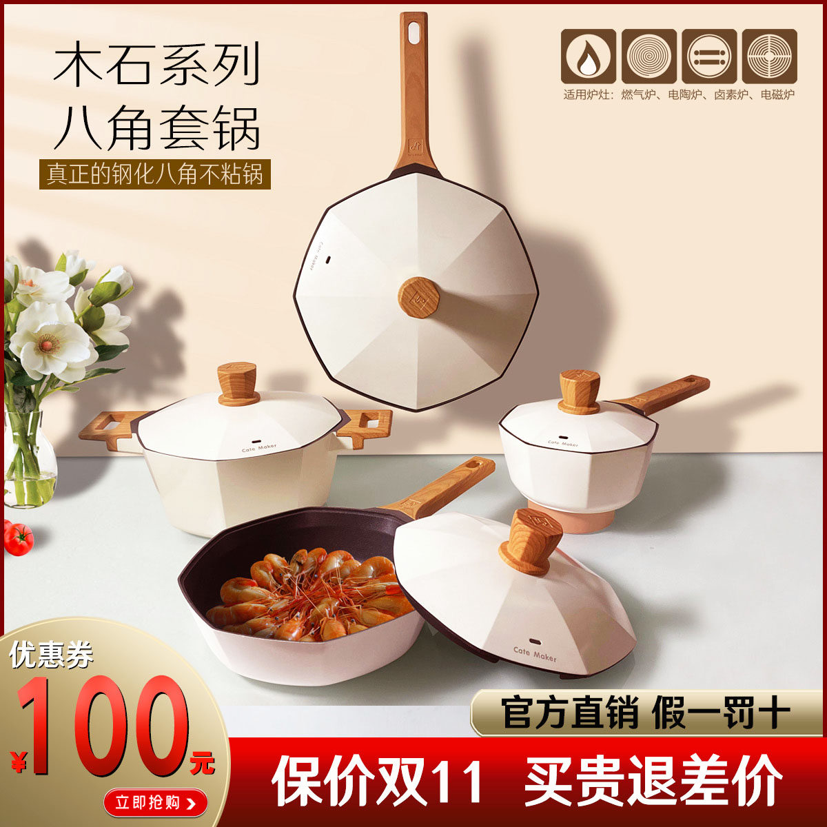 卡特马克八角锅具套装不粘锅炒锅平底煎锅汤锅奶锅平底锅燃具通用