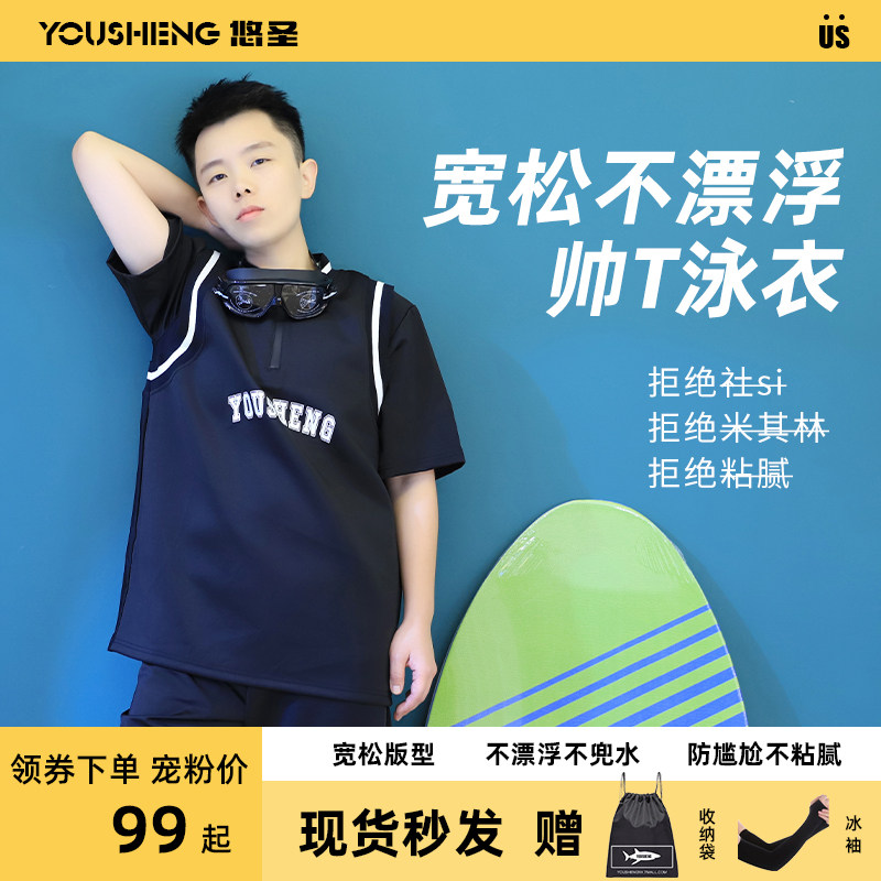 悠圣帅t束胸泳衣中性运动保守宽松游泳衣les胖t分体短袖泳装套装