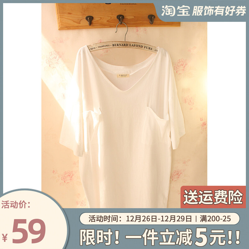 日系慵懒!春夏季新款短袖家居服女T恤V领性感纯棉睡衣宽松睡裙白