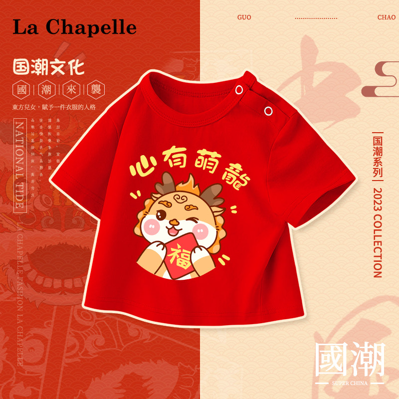拉夏贝尔宝宝纯棉t恤2024新款龙年儿童红色短袖新年衣服本命年服