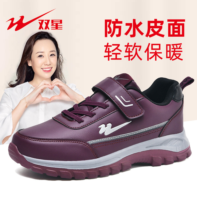 双星女鞋冬季皮面防水休闲鞋轻便防滑加绒跑步鞋中老年妈妈运动鞋