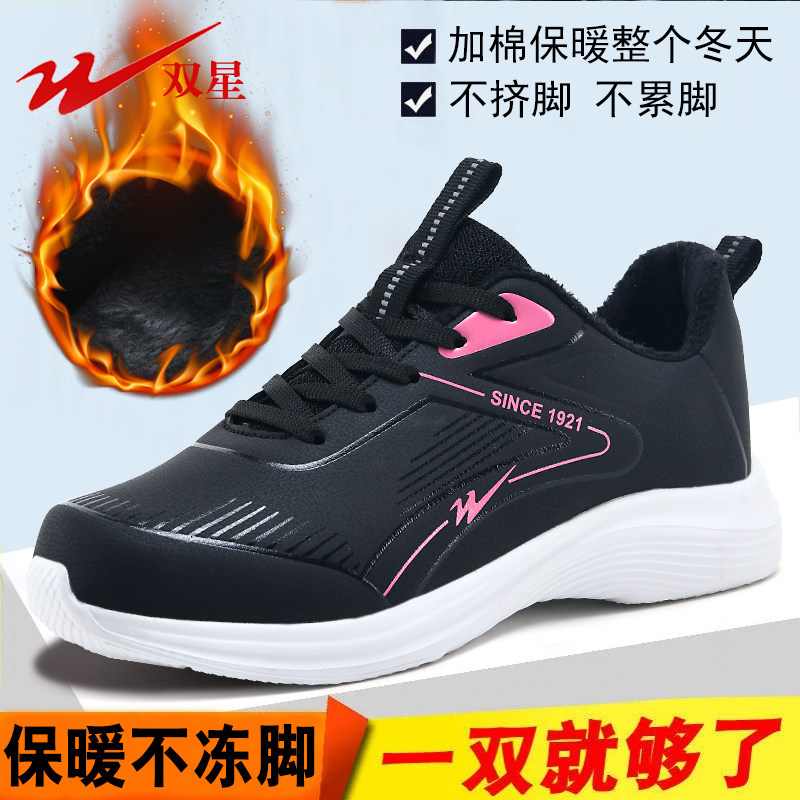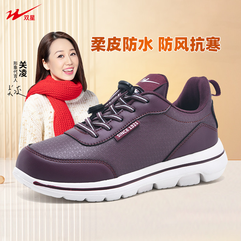 双星运动鞋女冬季加绒保暖棉鞋皮面防水休闲鞋轻便女鞋妈妈运动鞋