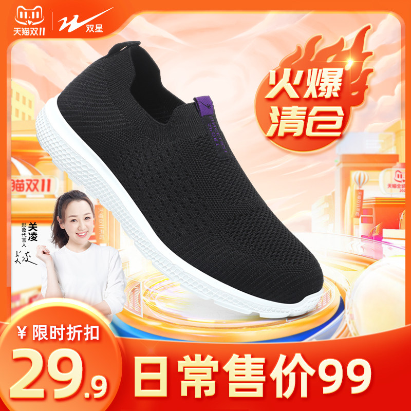 双星女鞋2023秋季新款一脚蹬懒人鞋透气平底妈妈鞋中老年运动鞋