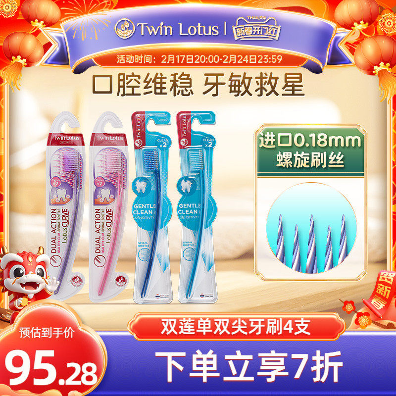 泰国双莲螺旋单双尖软毛男女士成人牙刷清洁牙齿柔软护龈家庭装