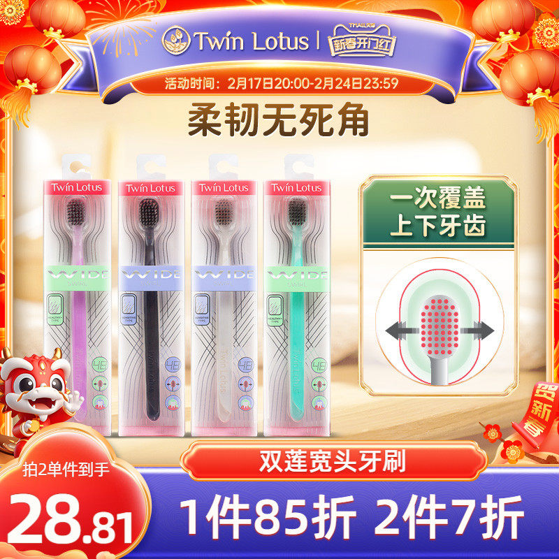 泰国双莲净齿亮洁宽头双尖螺旋软毛男女专用成人宽头牙刷清洁单支